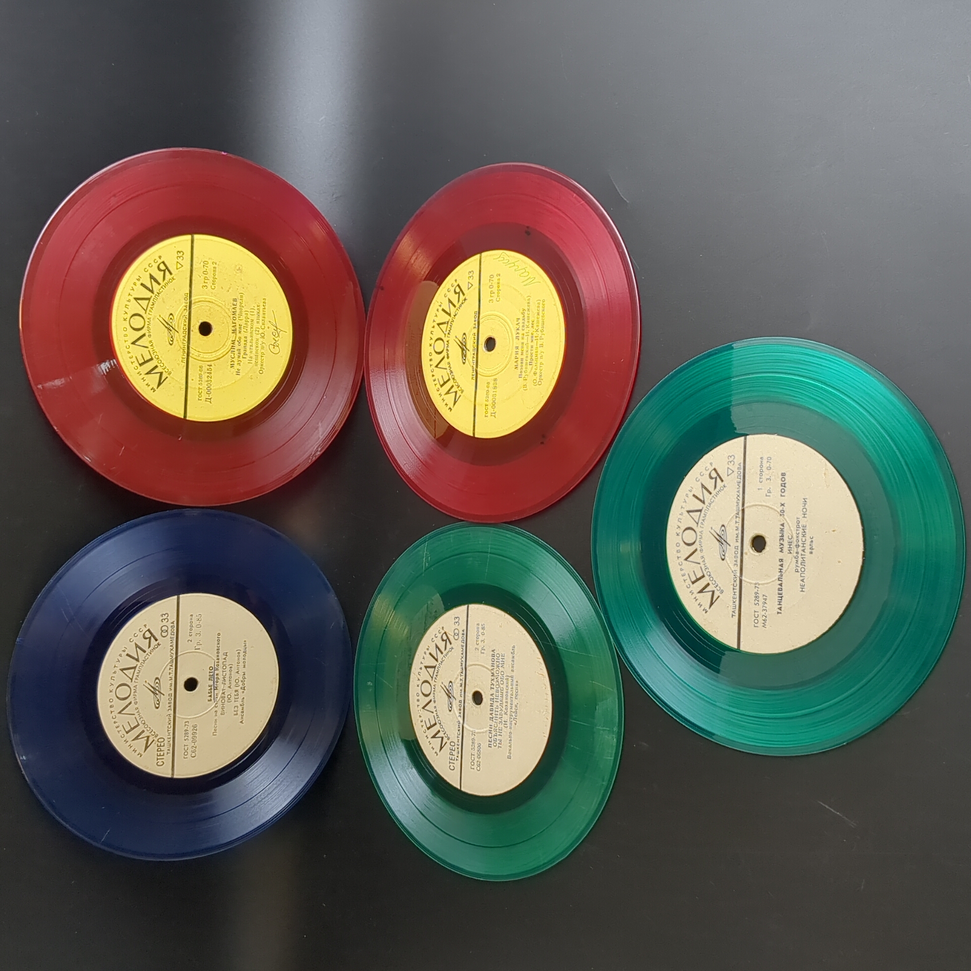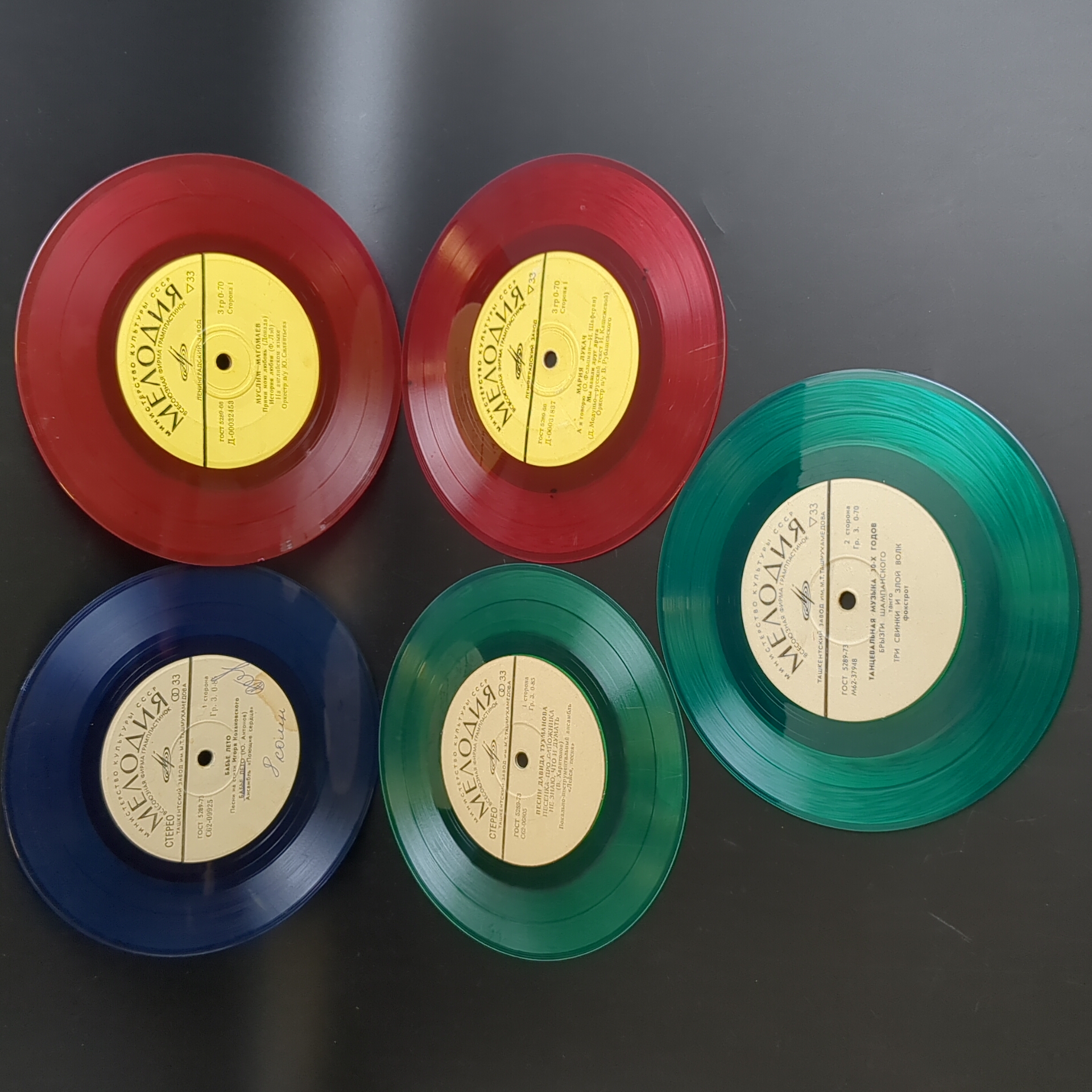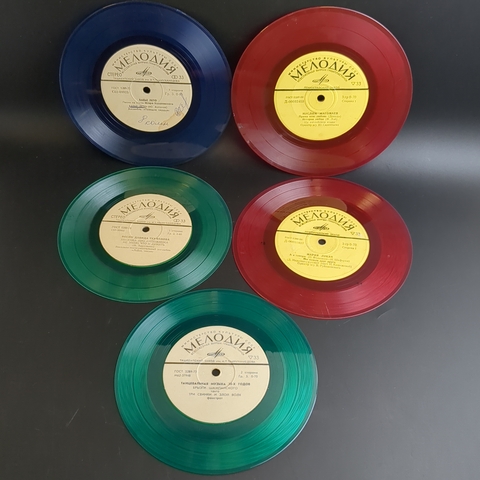 Набор из 5 цветных пластинок для декора. 5 Виниловых пластинок 7 дюймов миньоны / цветные редкие коллекционные пластинки. На пластинках присутствую царапины, продаются как для декора интерьера и для поделок. Состояние на фото. Красный винил, зеленый винил, синий винил. Панно на стене из пластинок может стать классическим вариантом декора. Стильное оформление подвесными пластинками на разных уровнях пользуется популярностью в ресторанах и барах в стиле 60-х-70-х. Сделать настенные часы станет еще одним интересным решением, этим точно можно удивить друзей и гостей. А еще, пластинки можно сделать виде вешалок, стильного ретро-табурета, экстравагантной люстры или создать свою необычную и неповторимую композицию для декора.