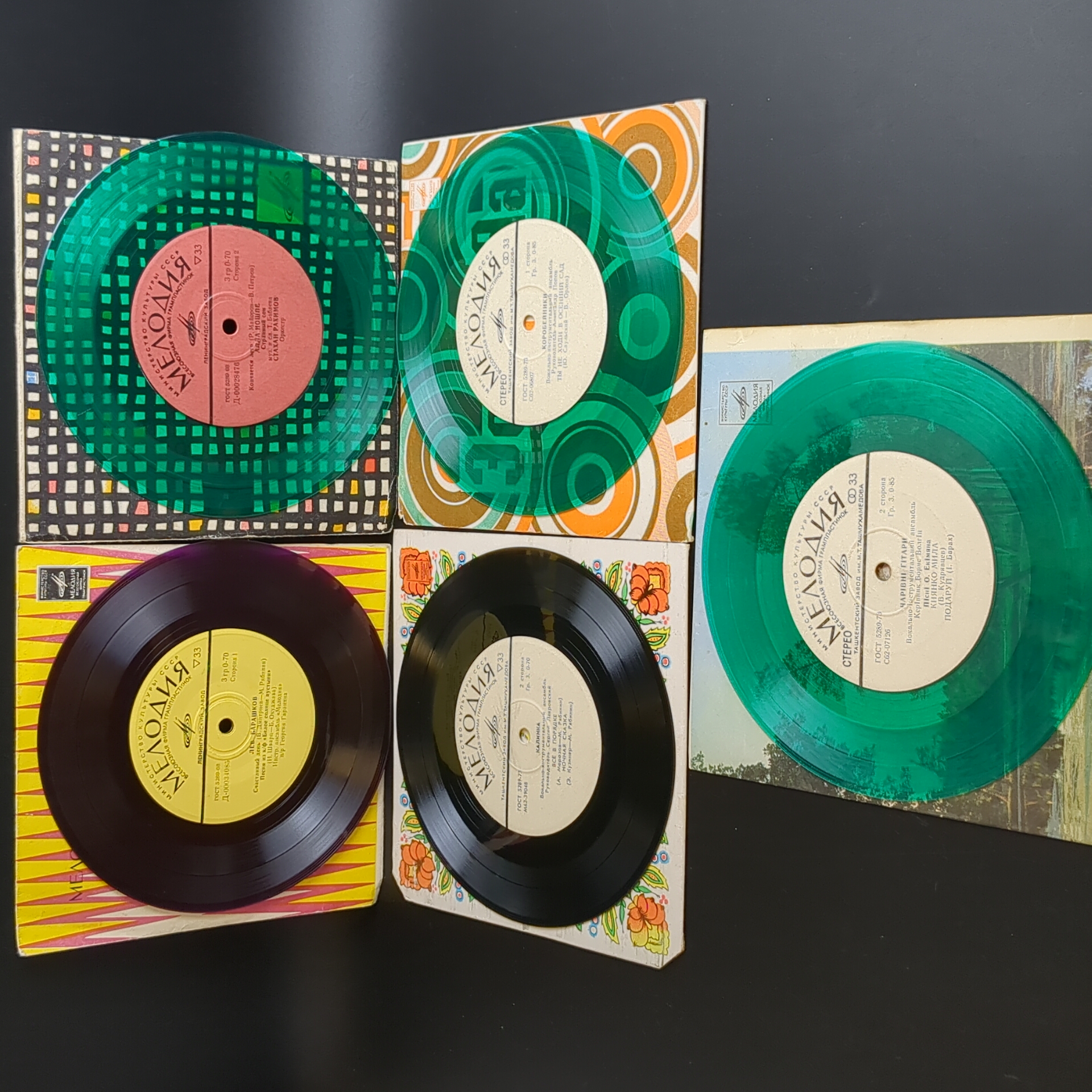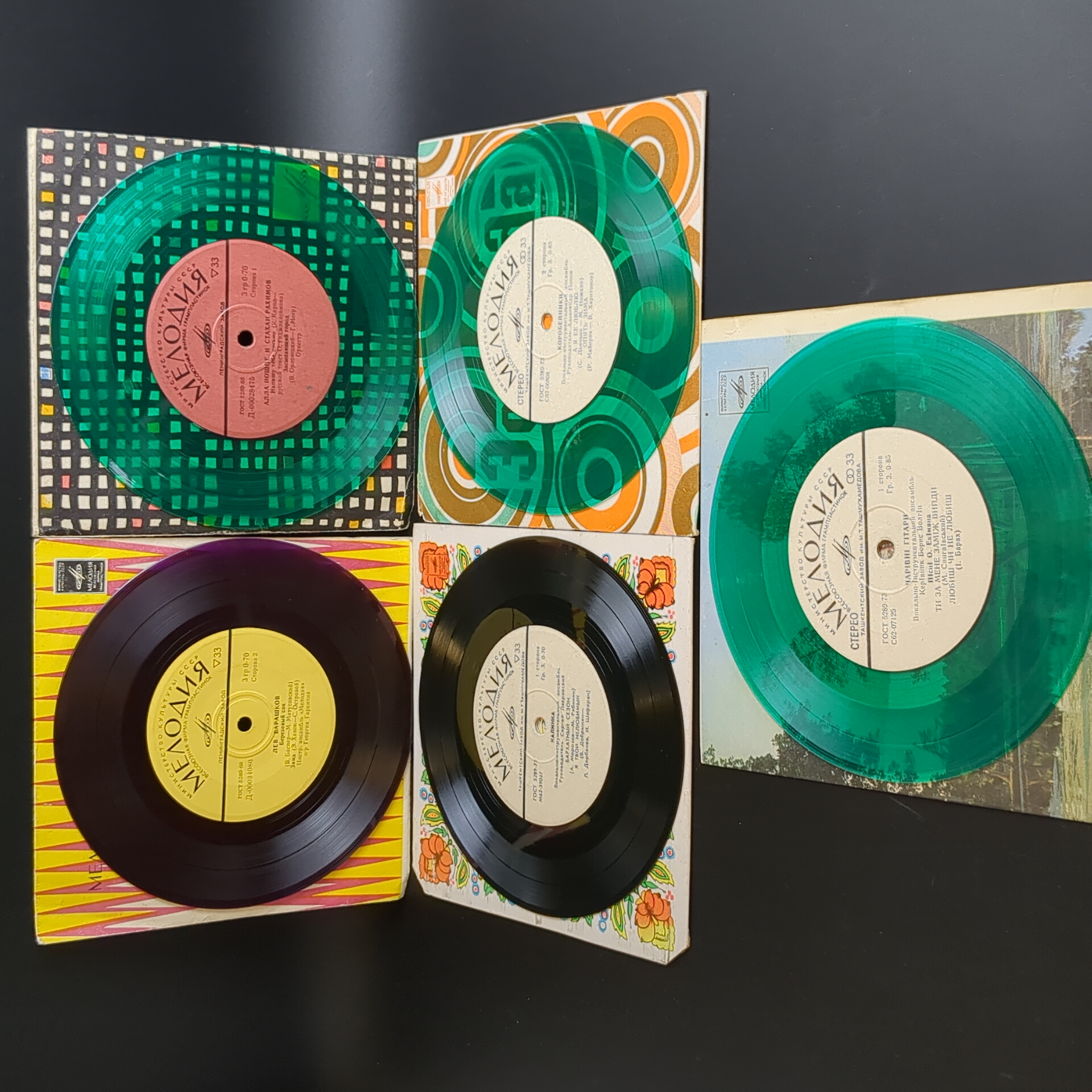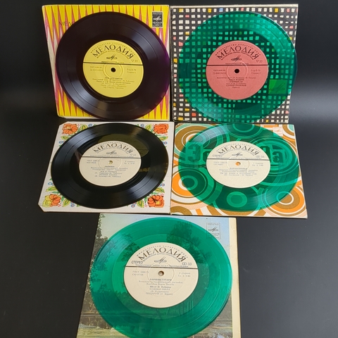 Набор из 5 цветных пластинок / цветные редкие коллекционные пластинки : ВИА Чаривни гитары - зелёный винил/ ВИА Коробейники - зелёный винил / ВИА Калинка - черно-жёлтый винил / Алла Иопше и Стахан Рахимов - зеленый винил / Лев Барашков - фиолетовый винил. 5 Виниловых пластинок 7 дюймов миньоны. Мелодия СССР. Конверты VG / Диски VG