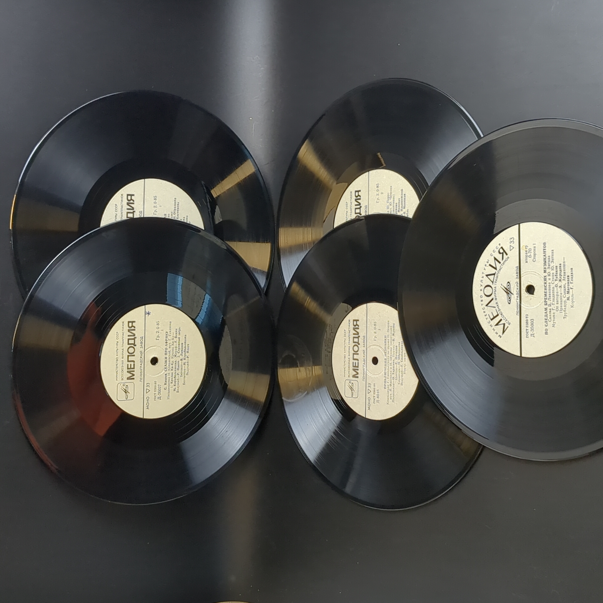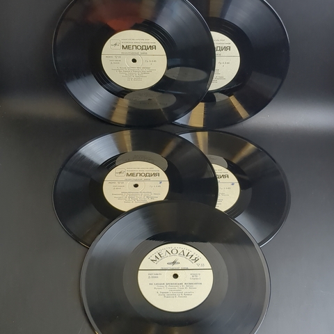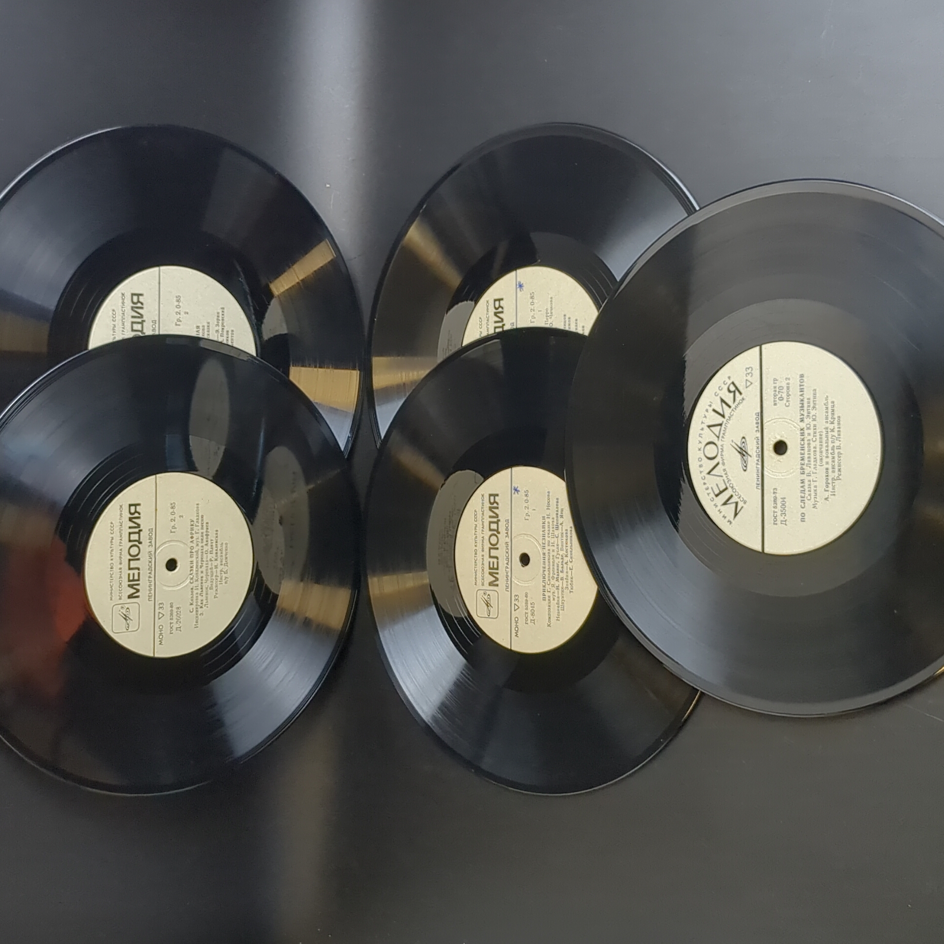 Набор из 5 виниловых пластинок 10 дюймов детские сказки и песни : Приключения Незнайки / Кот в сапогах и др. 5 Виниловых пластинок 12 дюймов. Мелодия СССР.