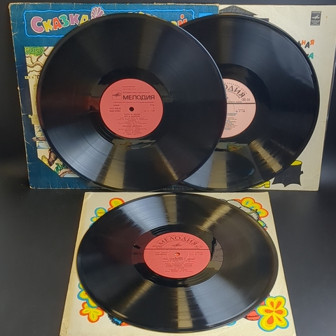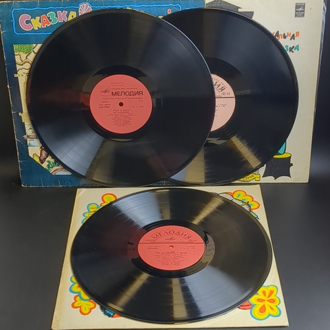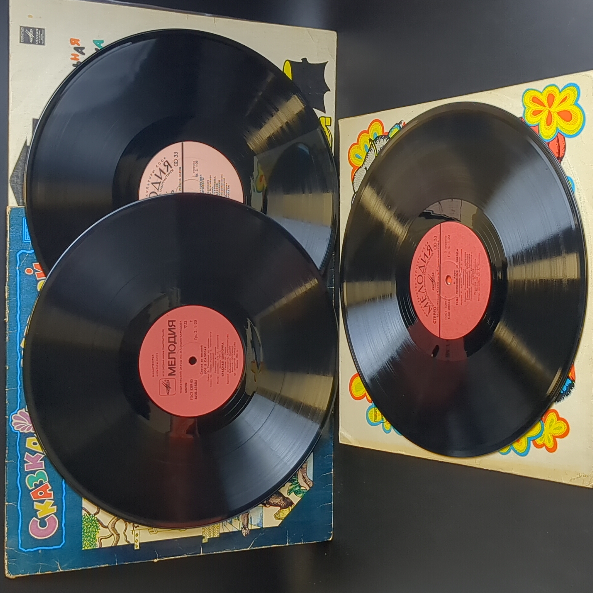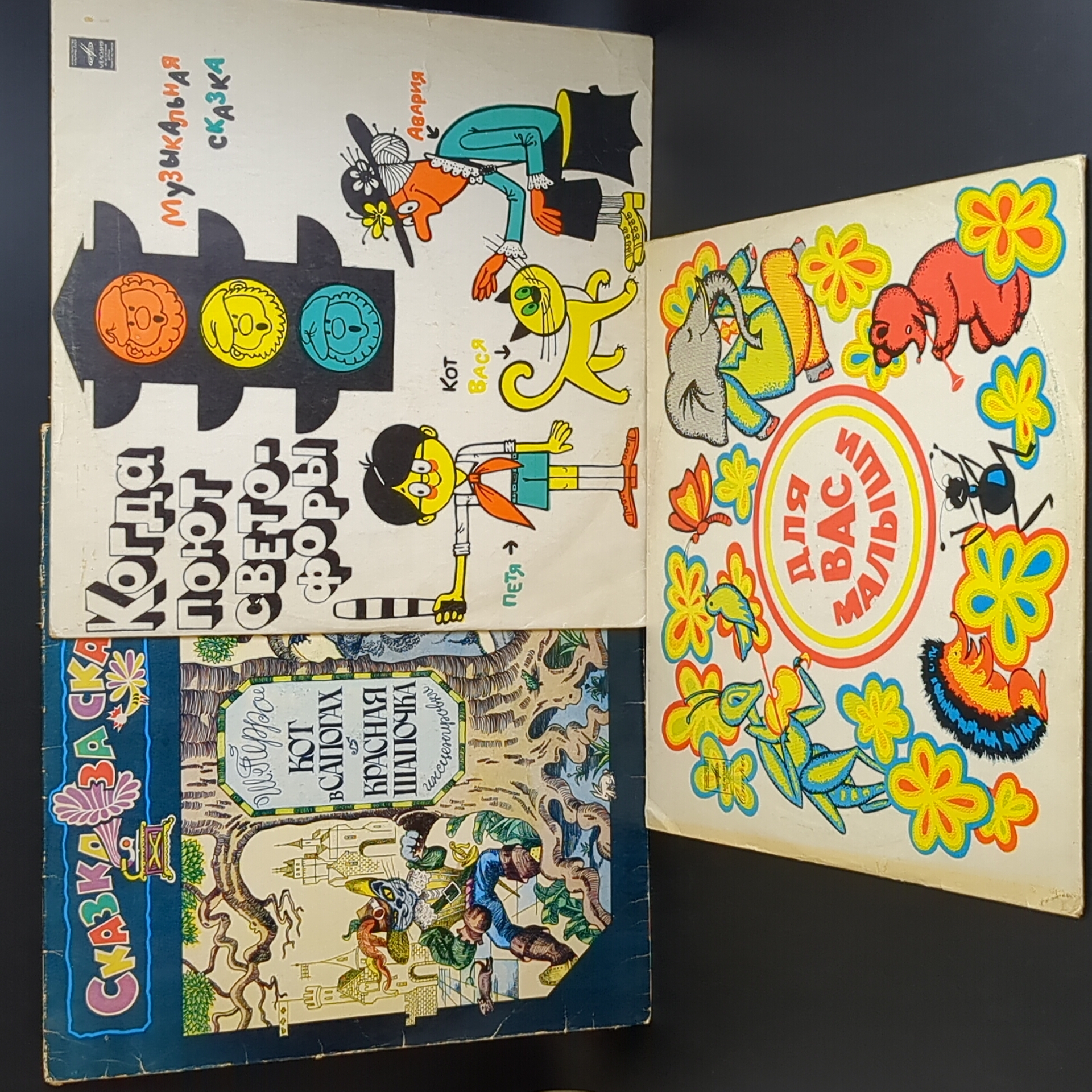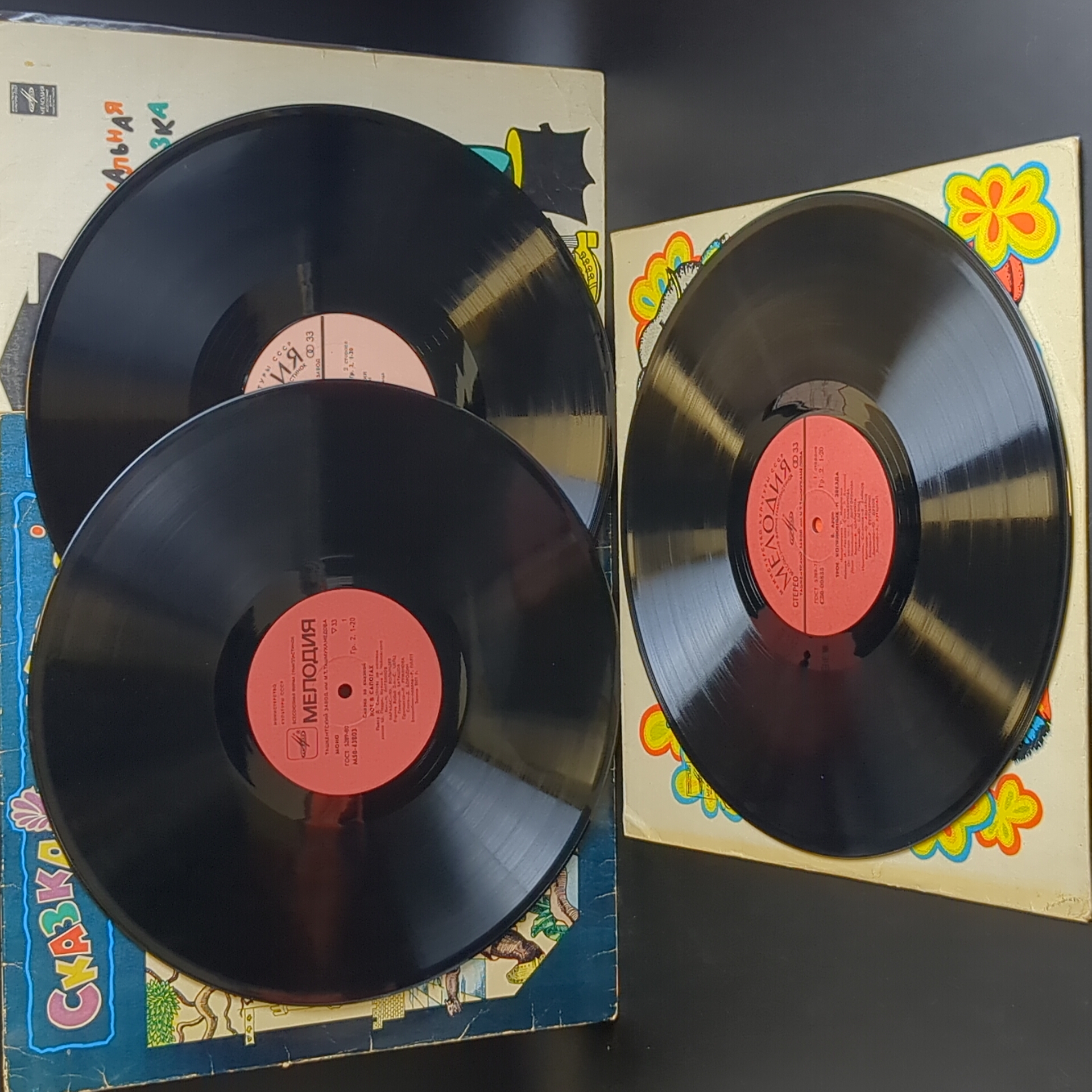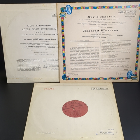 Набор из 5 виниловых пластинок 12 дюймов детские сказки и песни : Кот в сапогах / Красная шапочка / Когда поют светофоры - музыкальная сказка / Крокодил Гена / Трое копейкиных и звезда. 5 Виниловых пластинок 12 дюймов. Мелодия СССР.
