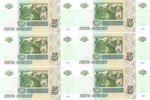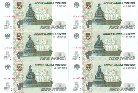 Набор из 6 банкнот 5 рублей 1997 Красивый номер 6879666 с разными сериями ьа, ьб, ьг, ьз, ье, чя