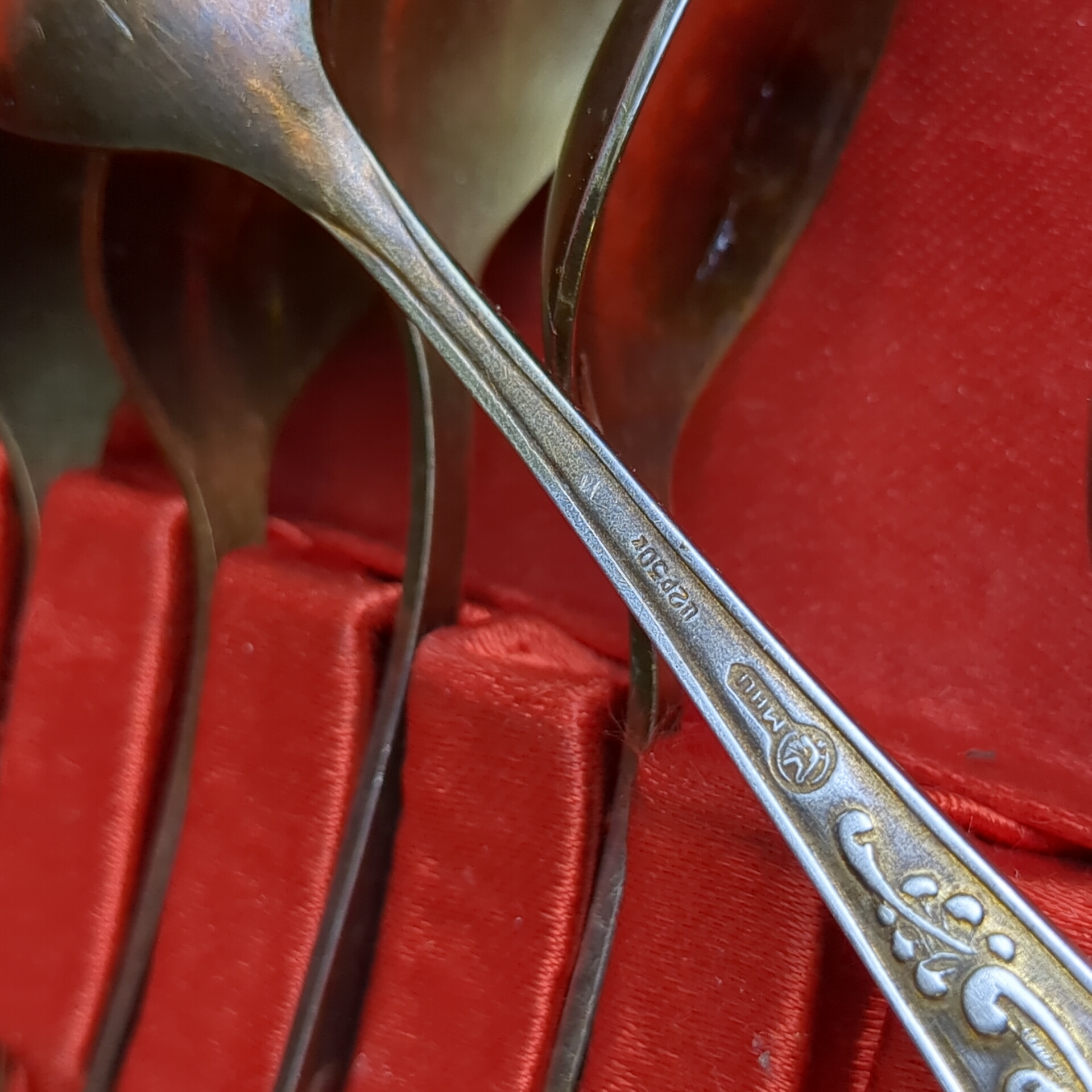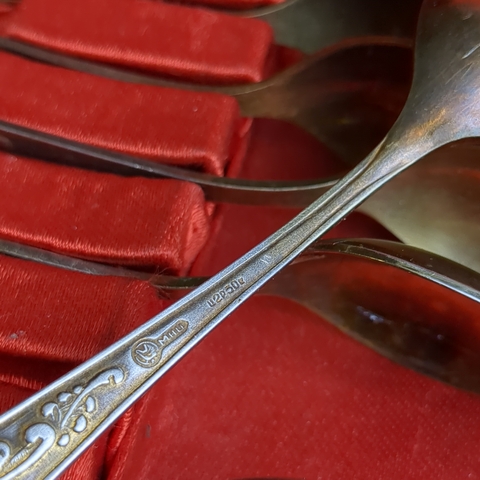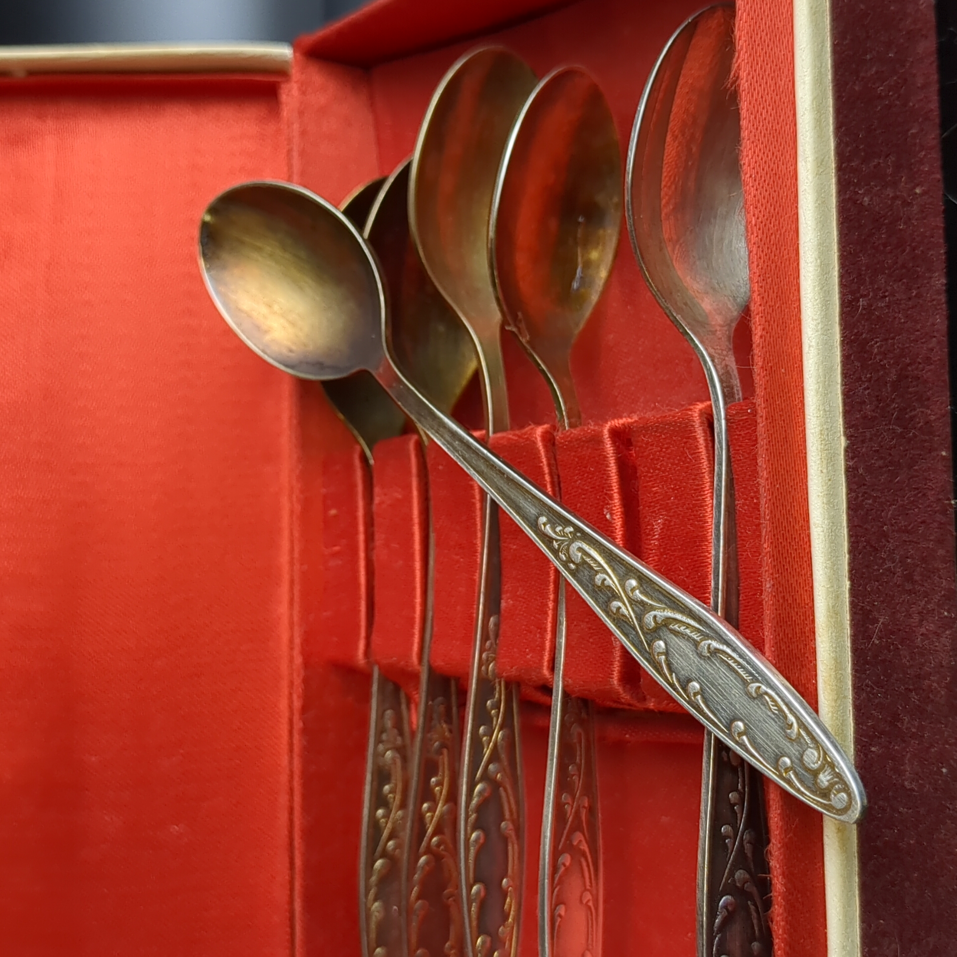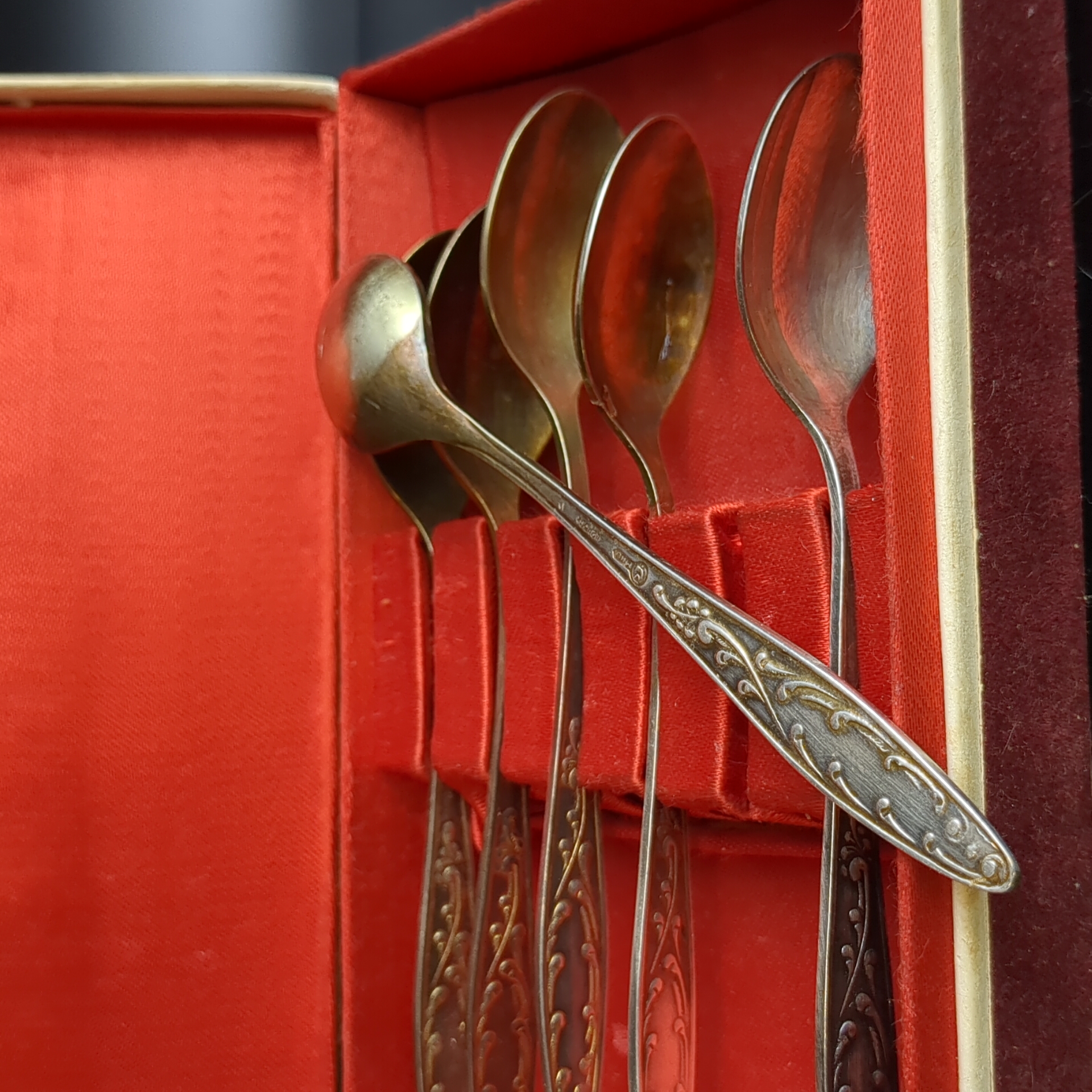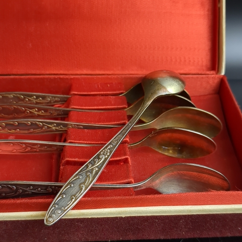 Набор из 6 чайных ложек "Пламя" с растительным декором в коробке, мНЦ (медь-никель-цинк), Кольчугинский завод цветных металлов, СССР, 1960-1980 гг.