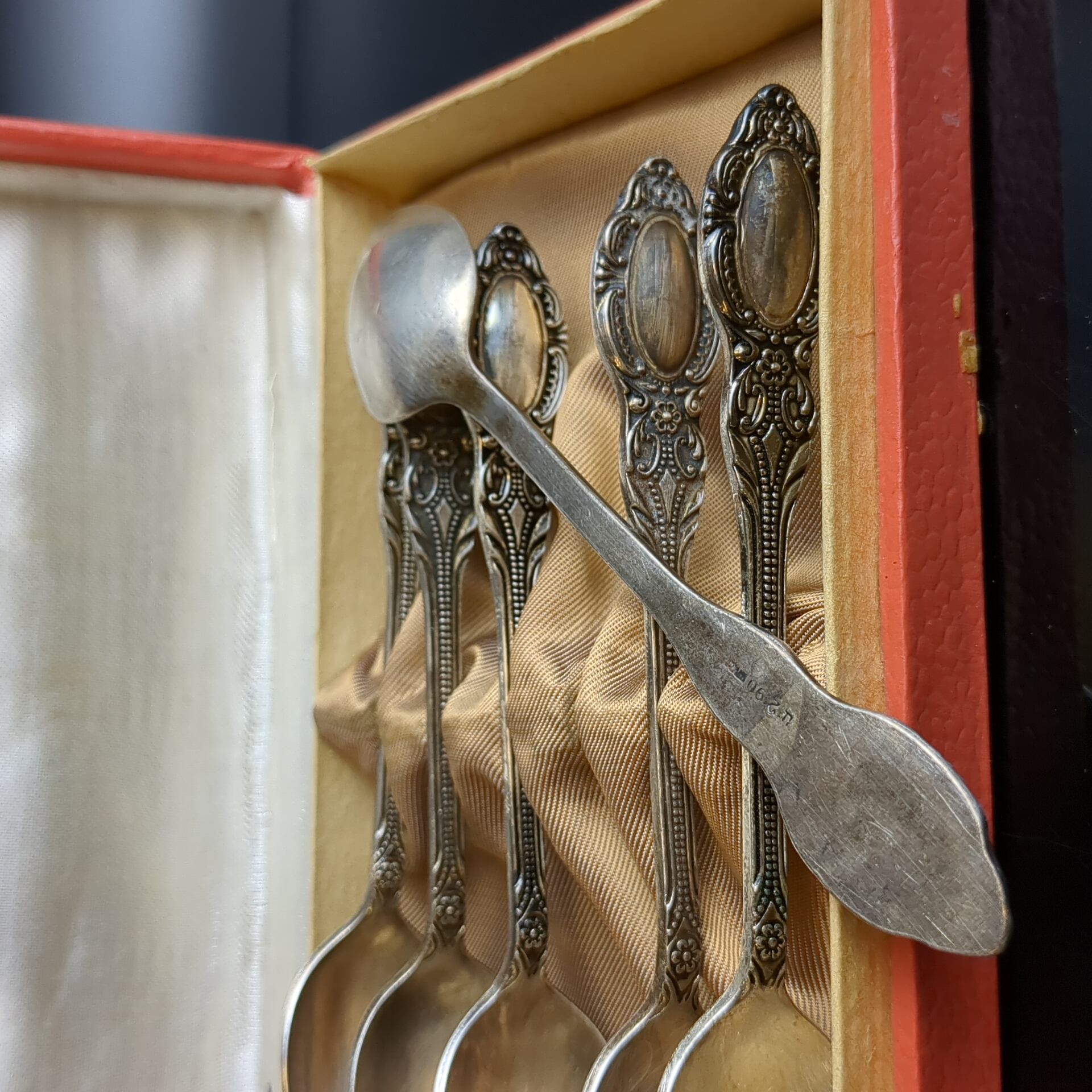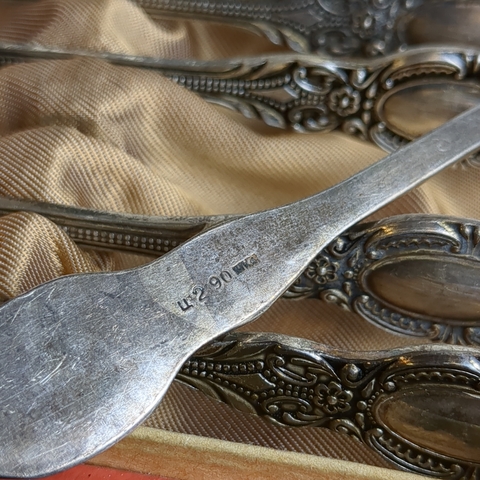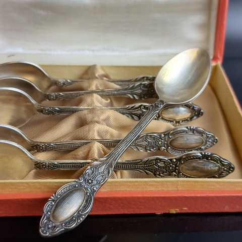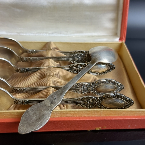 Набор из 6 чайных ложек с флоральным декором в коробке, мельхиор, Красносельская ювелирная фабрика, СССР, 1960-1980 гг.