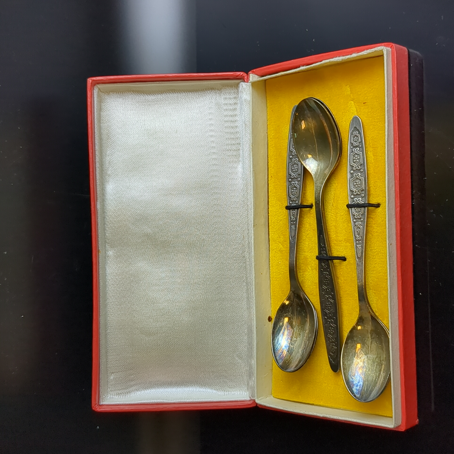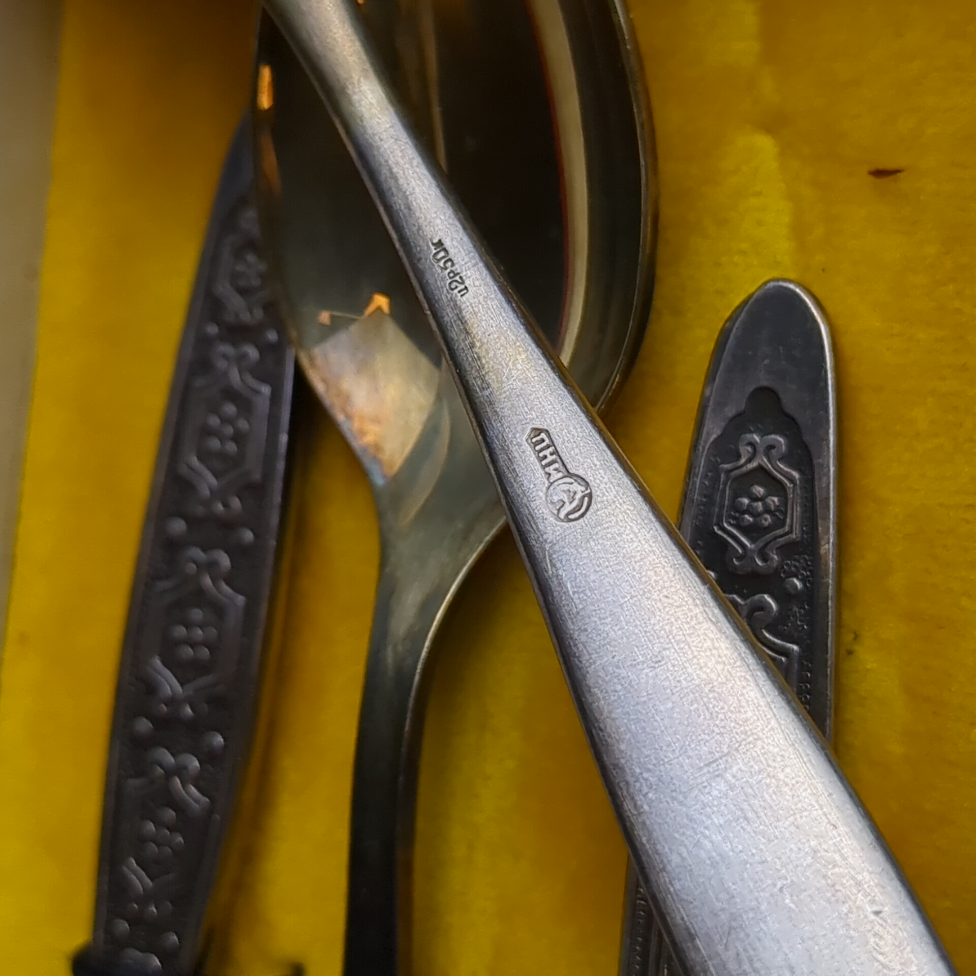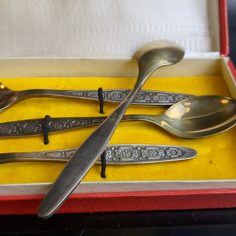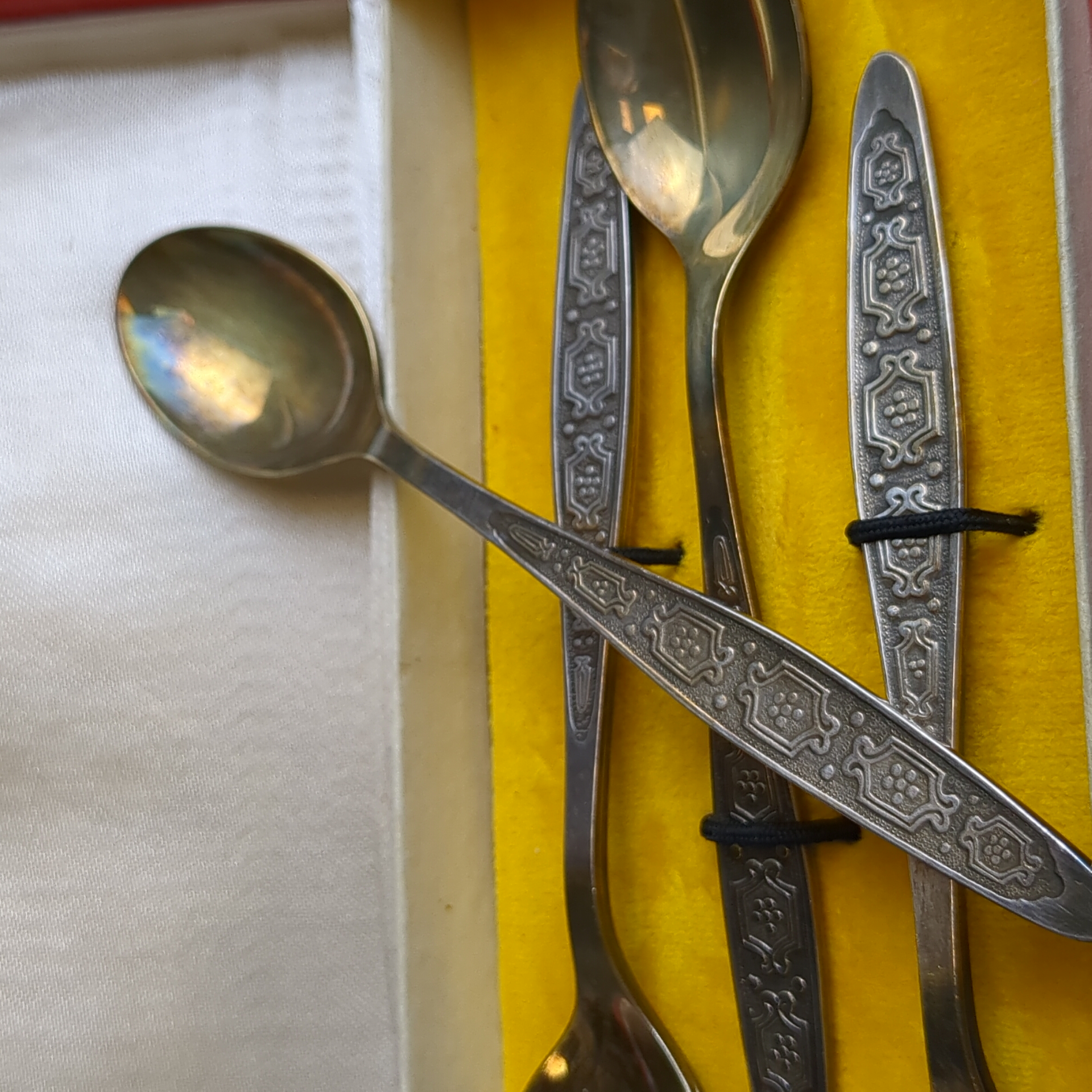 Набор из 6 чайных ложек с геометрическим орнаментом в коробке, мНЦ (медь-никель-цинк), Кольчугинский завод цветных металлов, СССР, 1960-1980 гг.