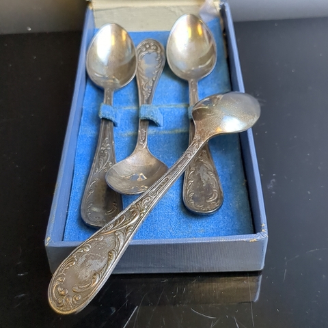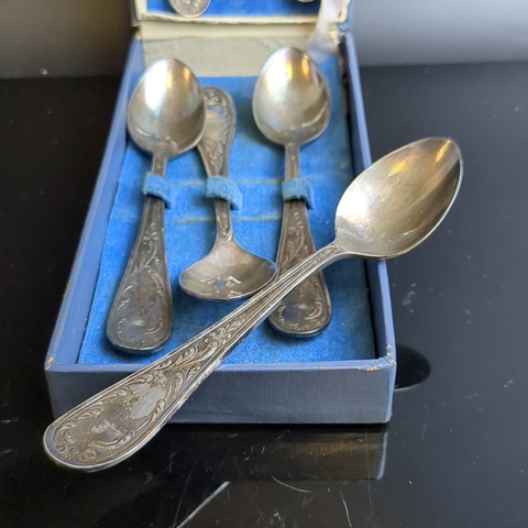 Набор из 6 чайных ложек с растительным декором в коробке, мНЦ (медь-никель-цинк), Кольчугинский завод цветных металлов, СССР, 1960-1980 гг.