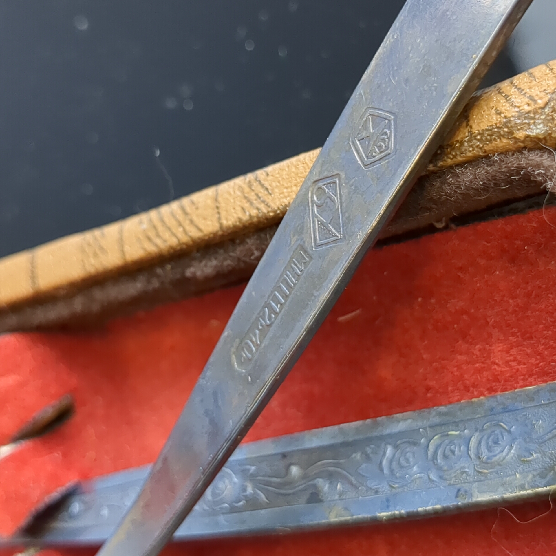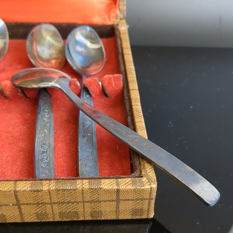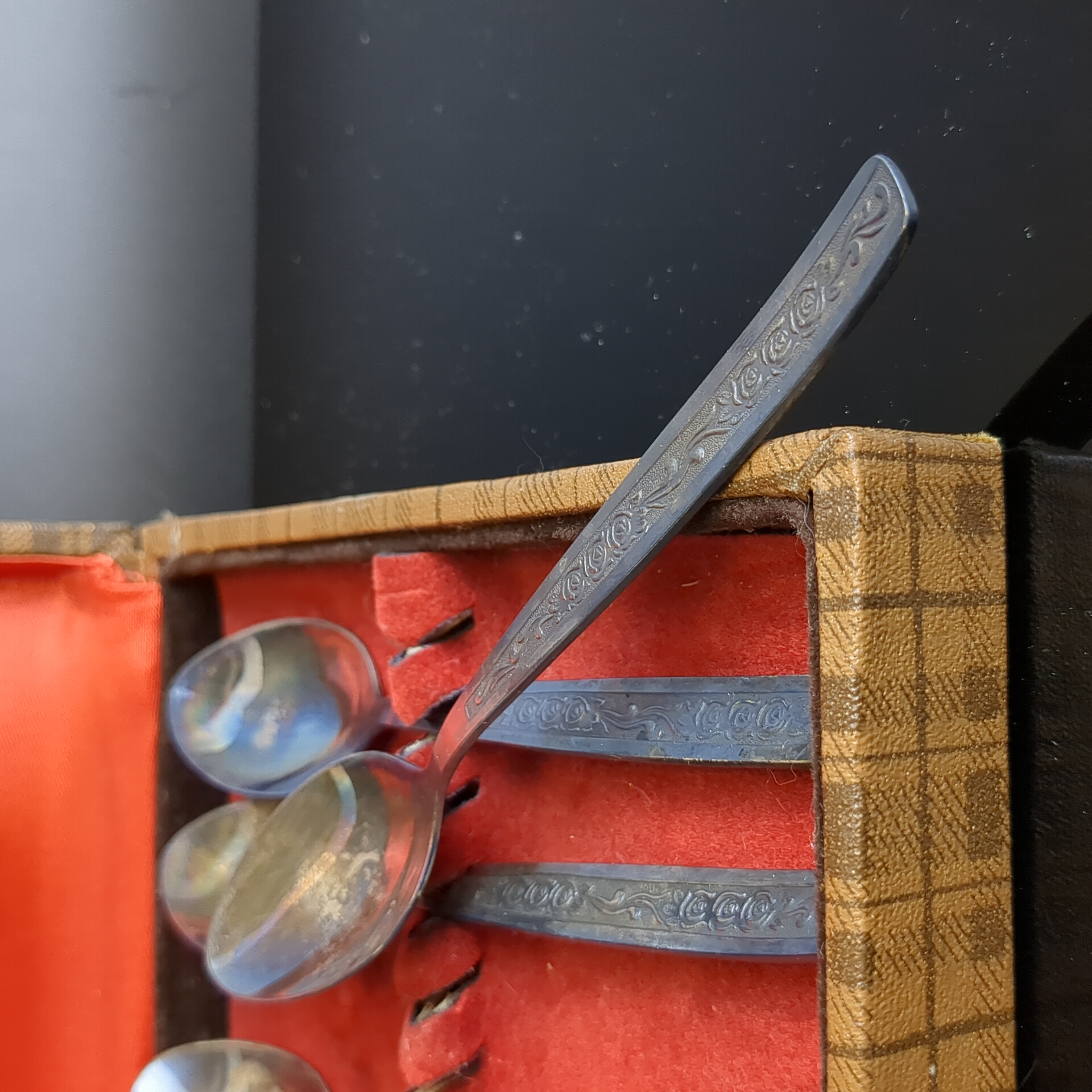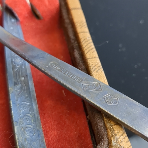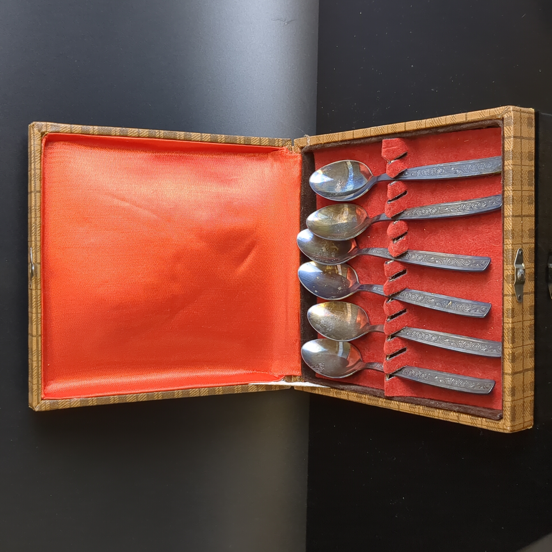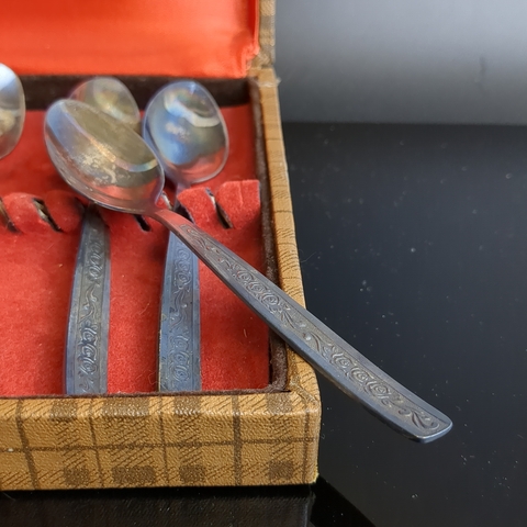 Набор из 6 чайных ложек с растительным декором в коробке, мНЦ (медь-никель-цинк), знак качества СССР, 1960-1980 гг.