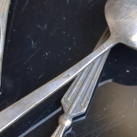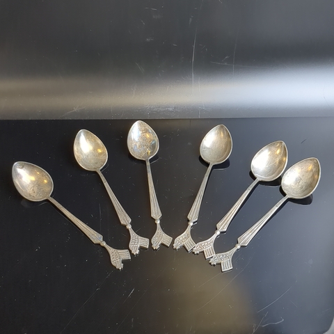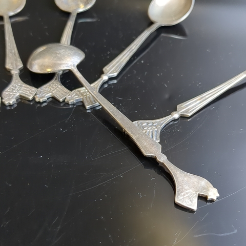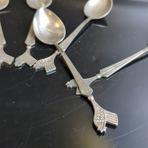 Набор из 6 чайных ложек в коробке. Черенок декорирован изображением петушка., мельхиор (медь-никель), Красносельская ювелирная фабрика, СССР, 1950-1960 гг. Присутствует естественная патина. Состояние на фото