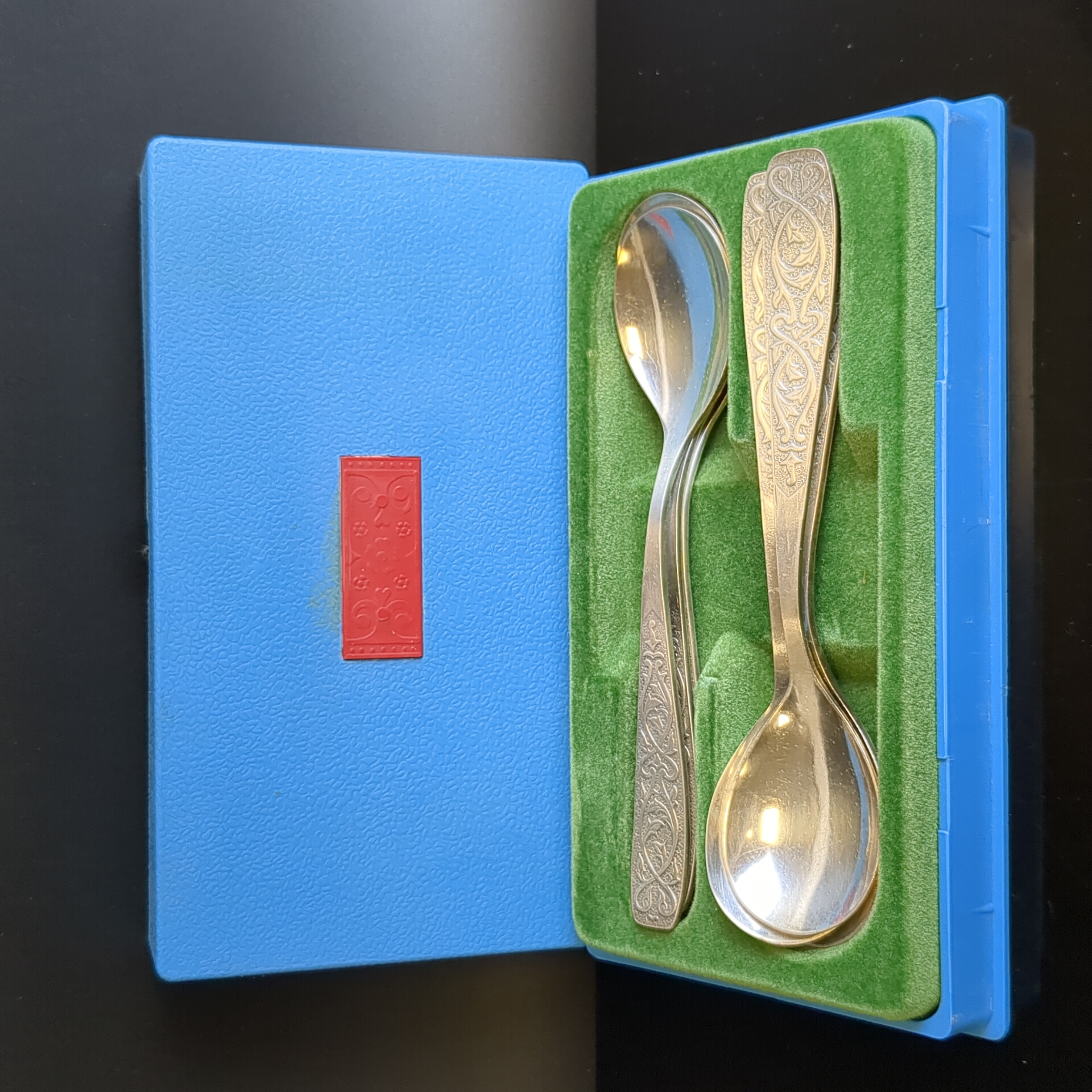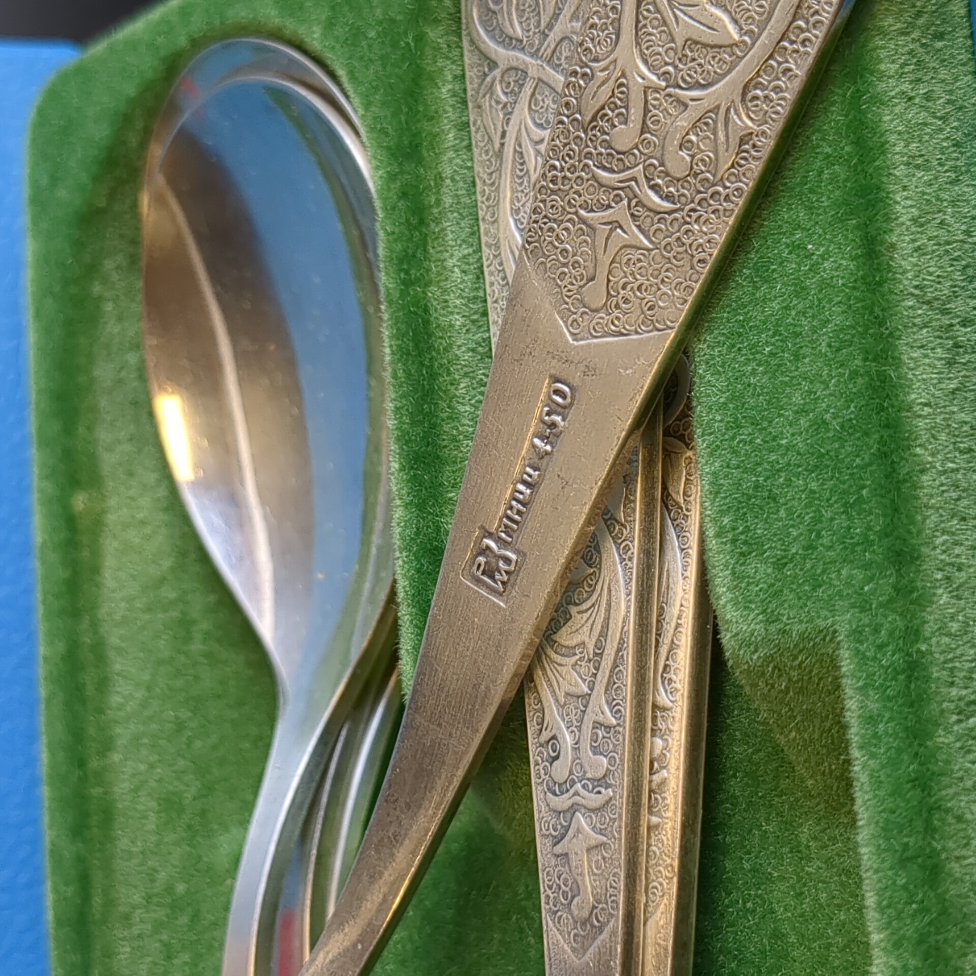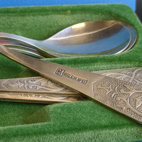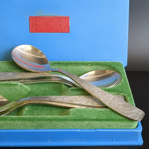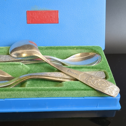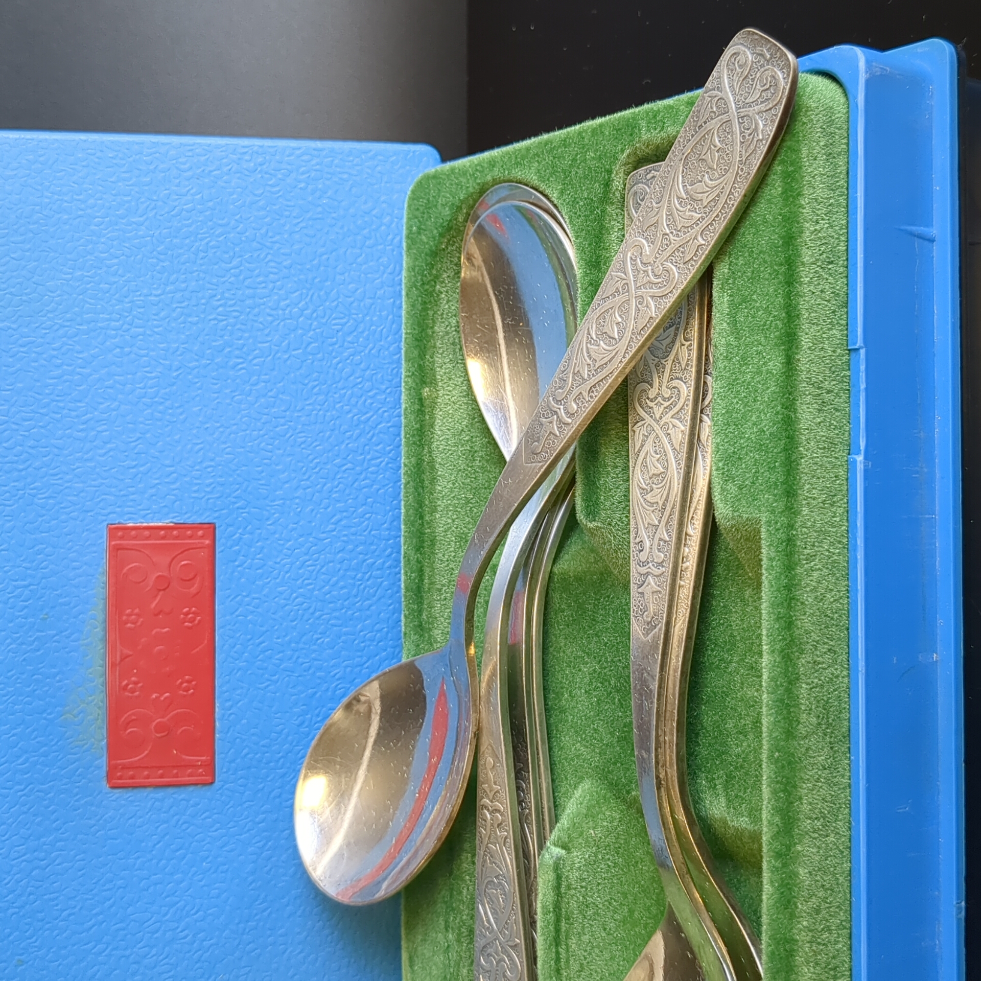 Набор из 6 десертных ложек, украшенных растительным декором, в оригинальной коробке, Ржевский механический завод, мНЦ (медь-никель-цинк), картон, металл, бумага, печать, СССР, 1983 г