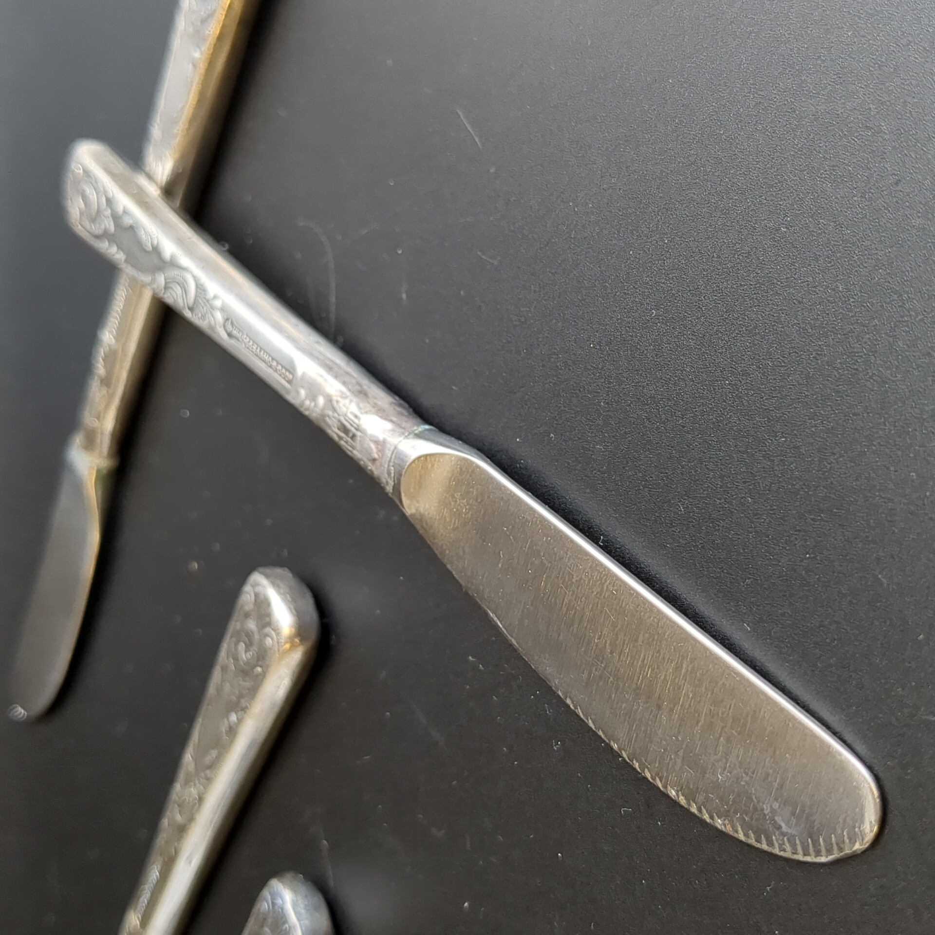 Набор из 6 десертных ножей с растительным декором, мНЦ (медь-никель-цинк). Сделано в СССР. Естественная патина. Длина ножа 18,6 см