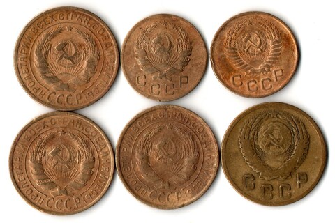 Набор из 6 монет 1 копейка 1936 , 54 и 2 копейки 1926, 31, 32, 54 гг. Ранний СССР