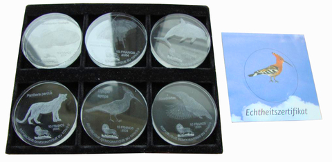 Набор из 6 монет 10 франков. Эндемическая фауна мира. Акрил. 2004 год.