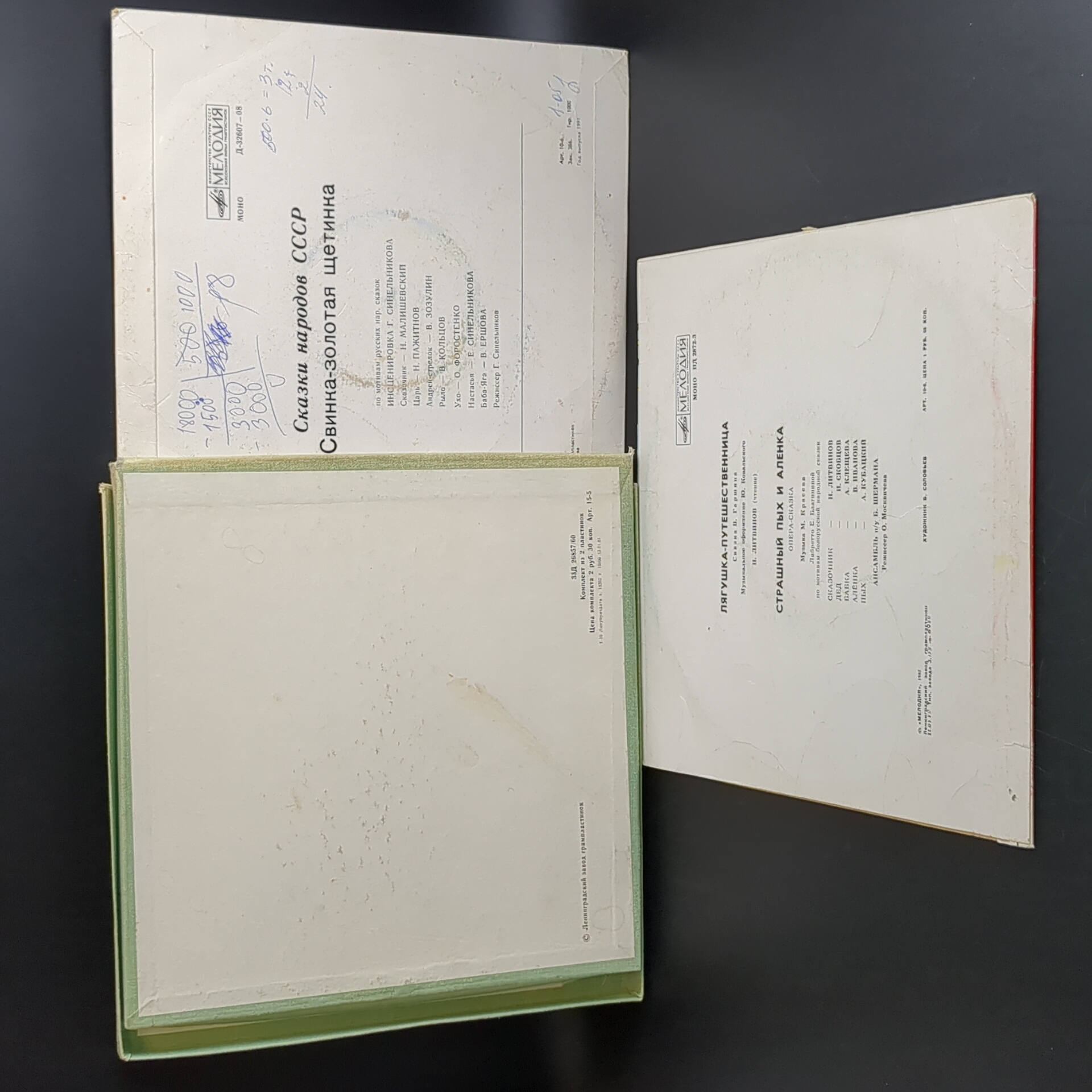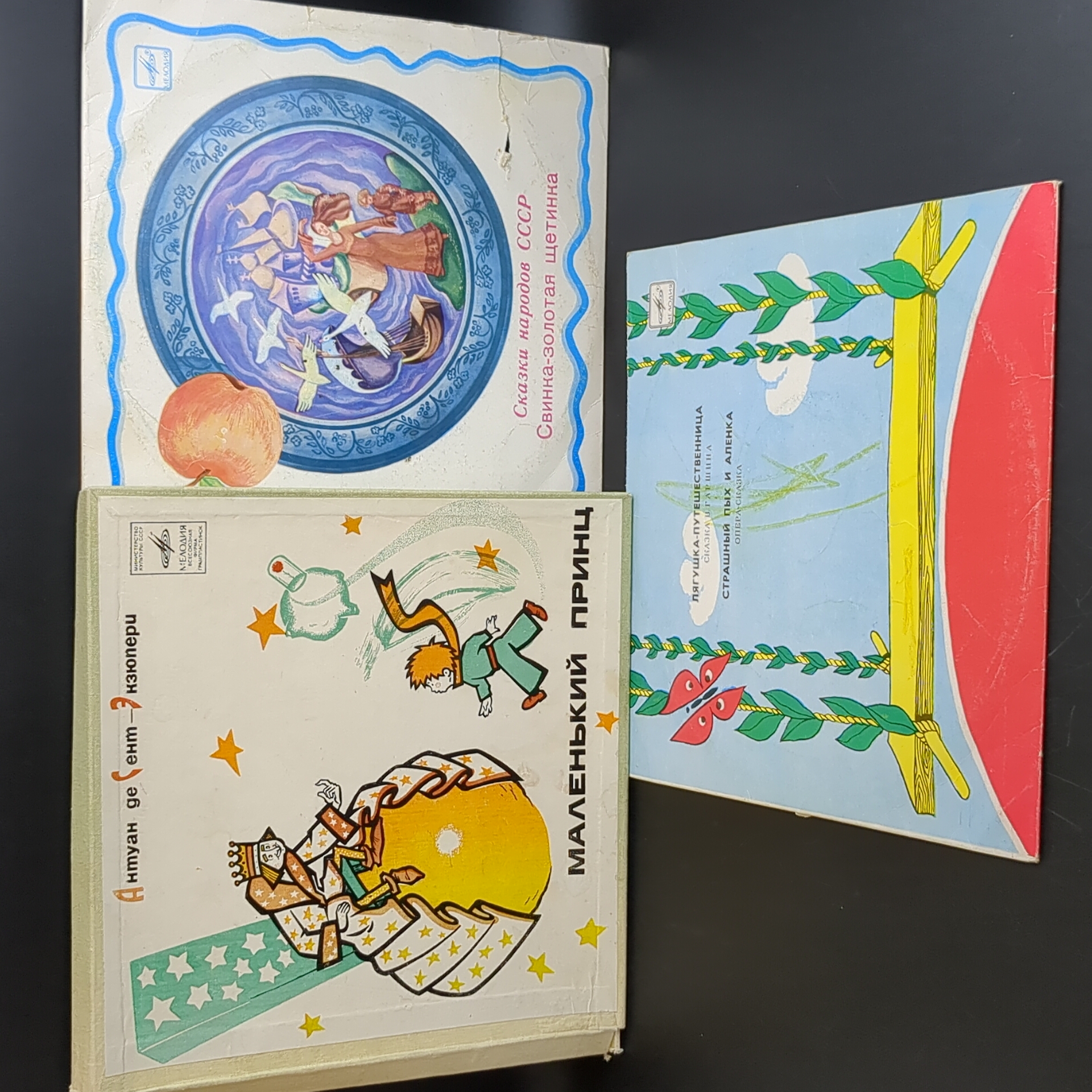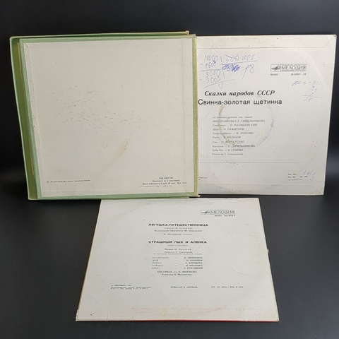 Набор из 6 виниловых пластинок 10 дюймов детские сказки и песни : Маленький Принц - 2 пластинки в боксе, в боксе есть дарственная надпись ручкой / Свинка - золотая щетинка - сказки народов СССР - надрыв конверта и надпись ручкой / Лягушка путешественница - надрыв конверта / 2 пластинки Сказки Пушкина : Сказка о рыбаке и рыбке / Сказка о царе Салтане / Сказка о Попе и работнике его Балде - надрыв конверта. 6 Виниловых пластинок 12 дюймов. Мелодия СССР. Конверты F с надрывами / Диски VG