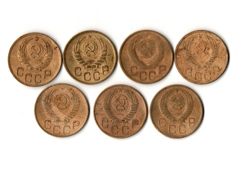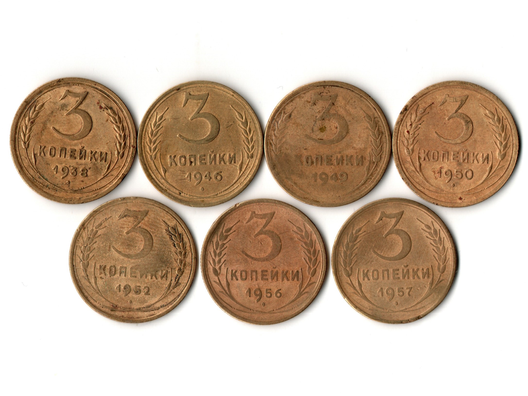 Набор из 7 монет 3 копейки 1938, 46, 49, 50, 52, 56, 57 гг. ранний СССР