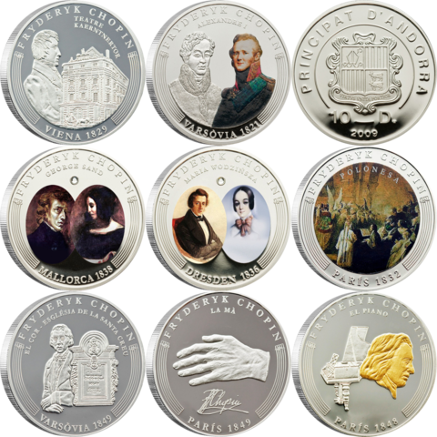 Набор из 8 монет 10 динаров. Фредерик Шопен композитор Рояль. Андорра 2009 год. PROOF