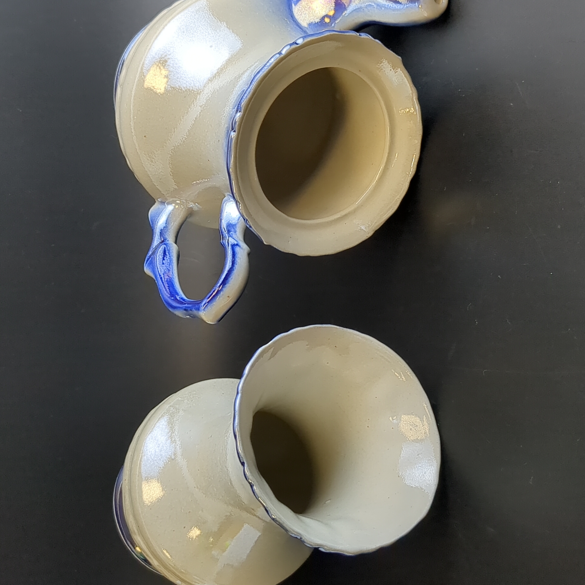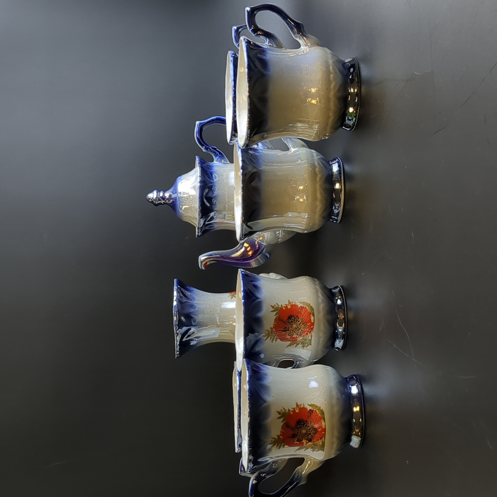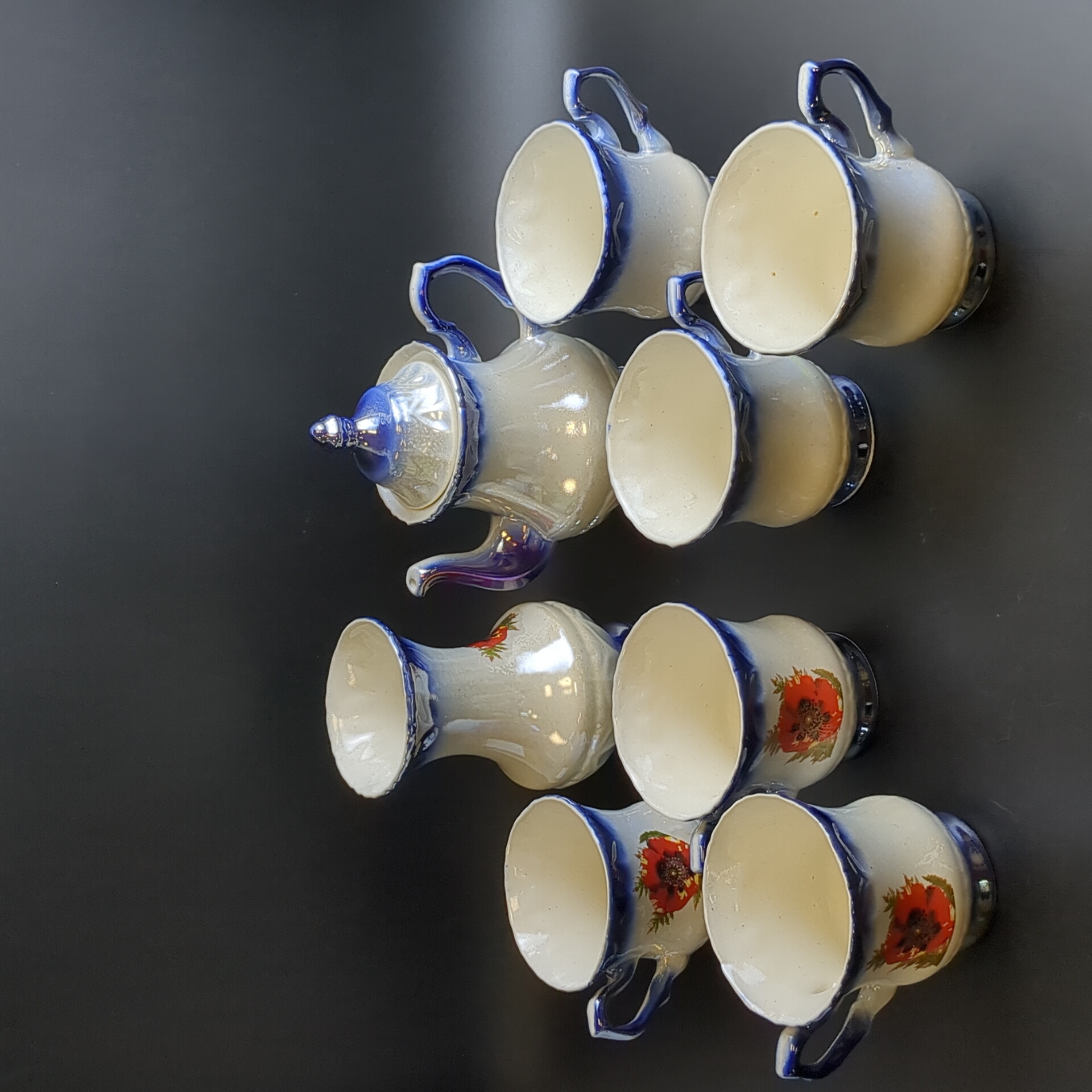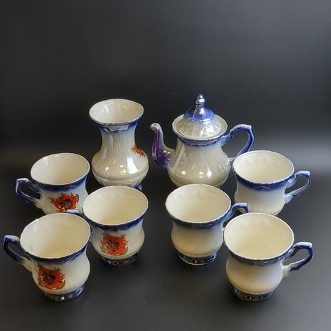 Набор из советской керамики Чайник заварочный, 6 чайных чашек и ваза для цветов (8 предметов), деколь, перламутр, винтаж СССР 1970-1991 гг. Высота чайника - 18 см, высота вазы - 15 см. Состояние и комплектация на фото.