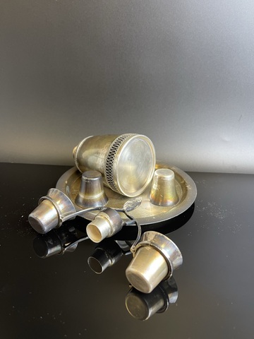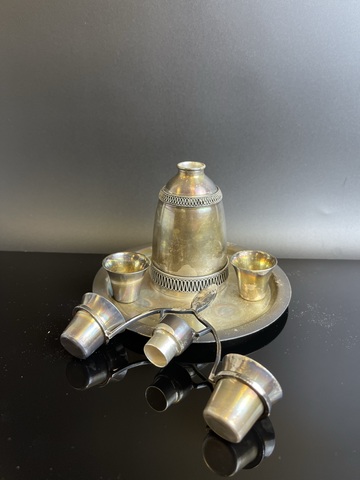 Набор шикарный коньячный "Девушка с коромыслом" штоф, поднос, и 4 стопки, мельхиор, золочение, винтаж, СССР 1970-1980 гг. Клеймо на подносе - МК1. Высота штофа - 15.5 см, диаметр подноса - 14.5 см, высота рюмочки - 3 см. В коллекцию. Состояние на фото.