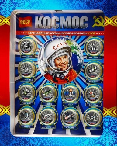 Набор из 12 цветных гравированных 25-рублевых монетах в планшете, в коробке, посвященный легендарным космческим аппаратам СССР.