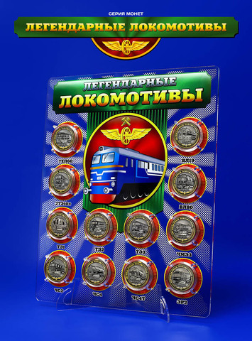 Набор цветных гравированных 10-рублевых монет на планшете, посвященный легендарным легендарным локомотивам СССР и России.