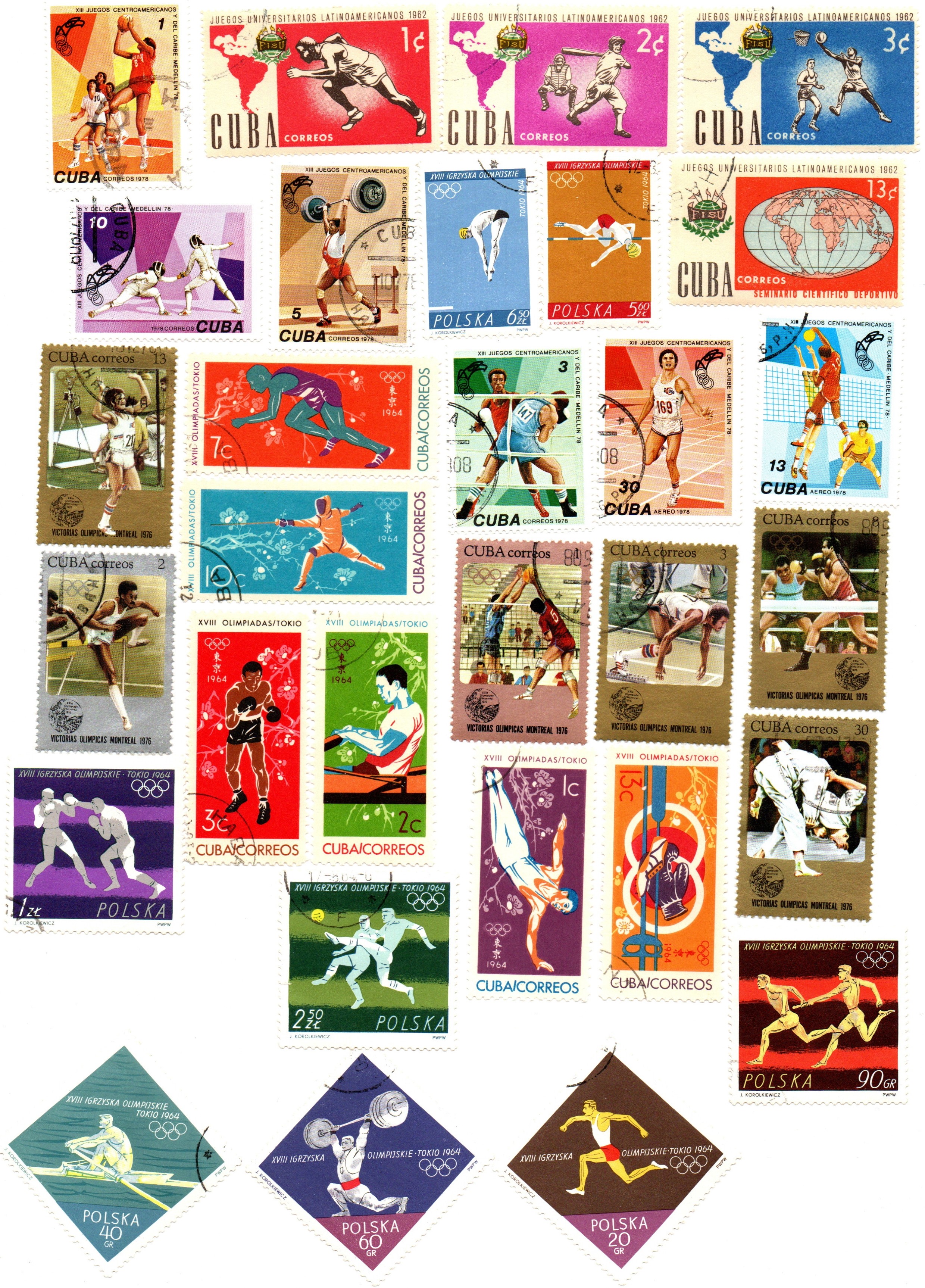 Набор марок Спорт бокс баскетбол легкая атлетика 30 шт. 1962, 64, 76 гг Польша Куба XF