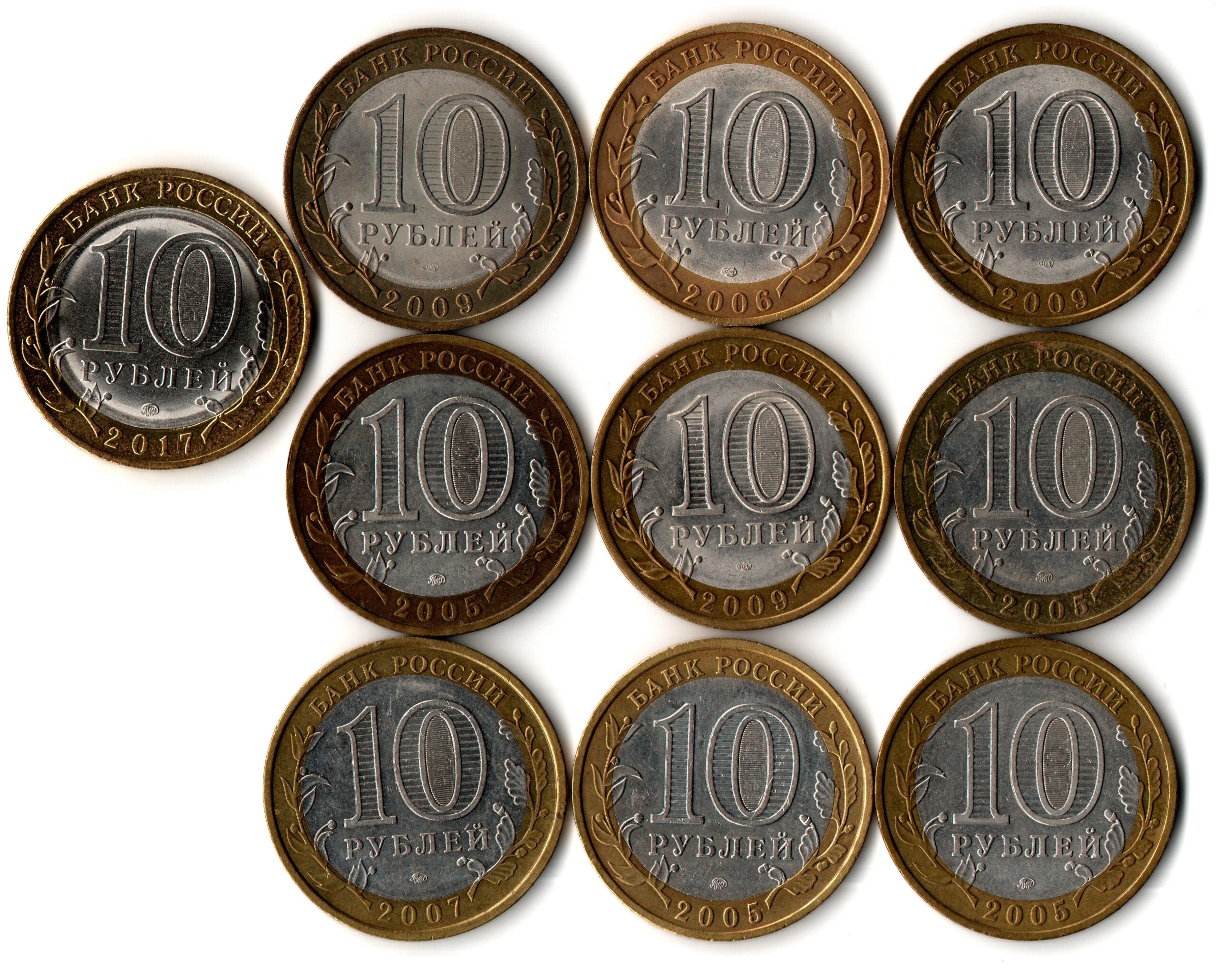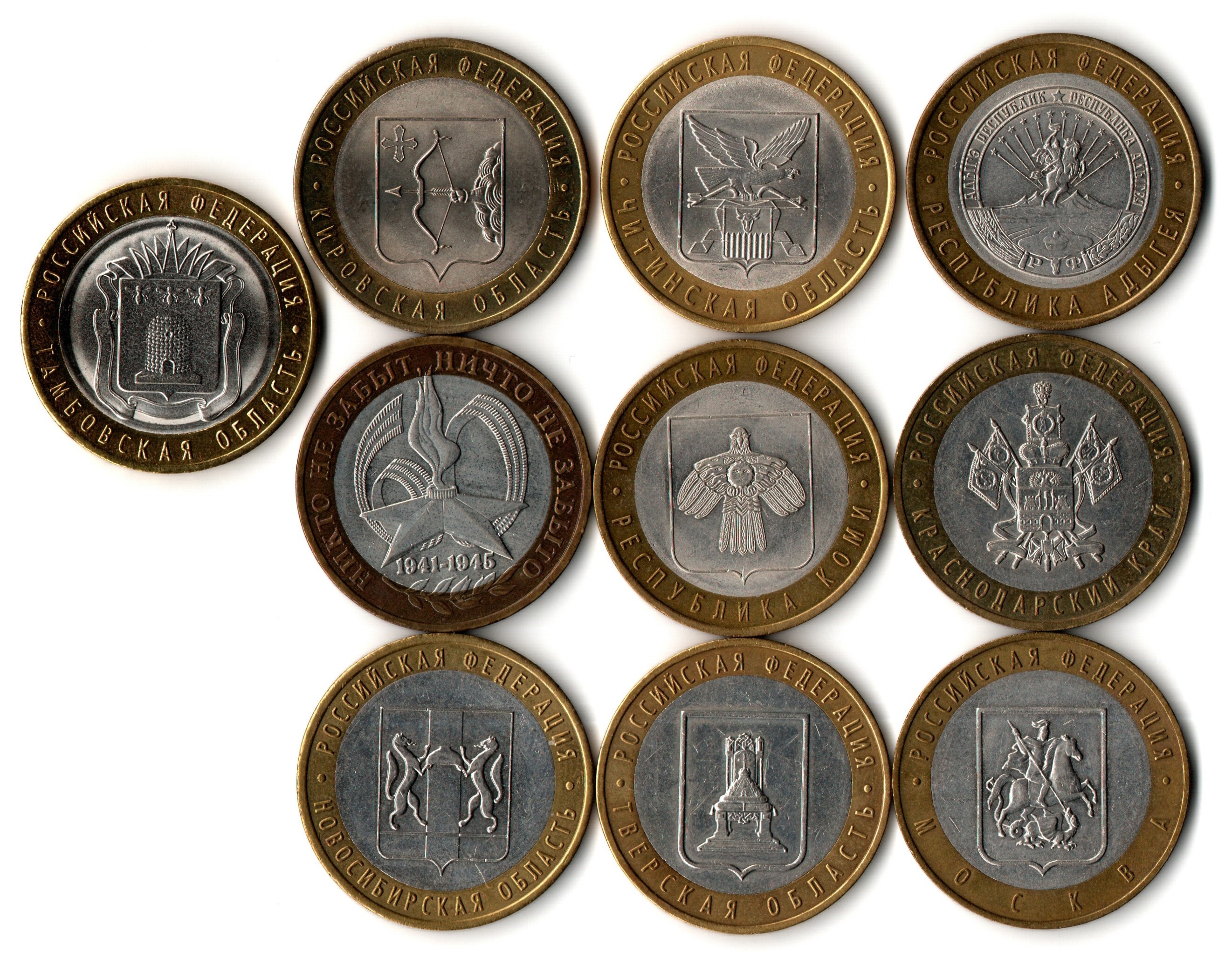 Набор монет 10 рублей биметалл 10 шт Новосибирская, Москва, Тверская, Вечный огонь, Читинская, Тамбов, Киров, Адыгея, Краснодарский, Коми XF