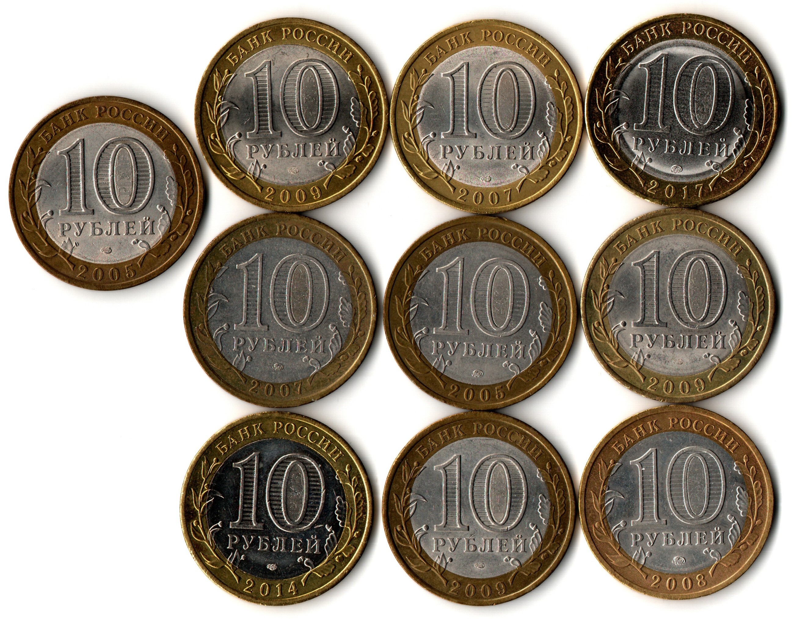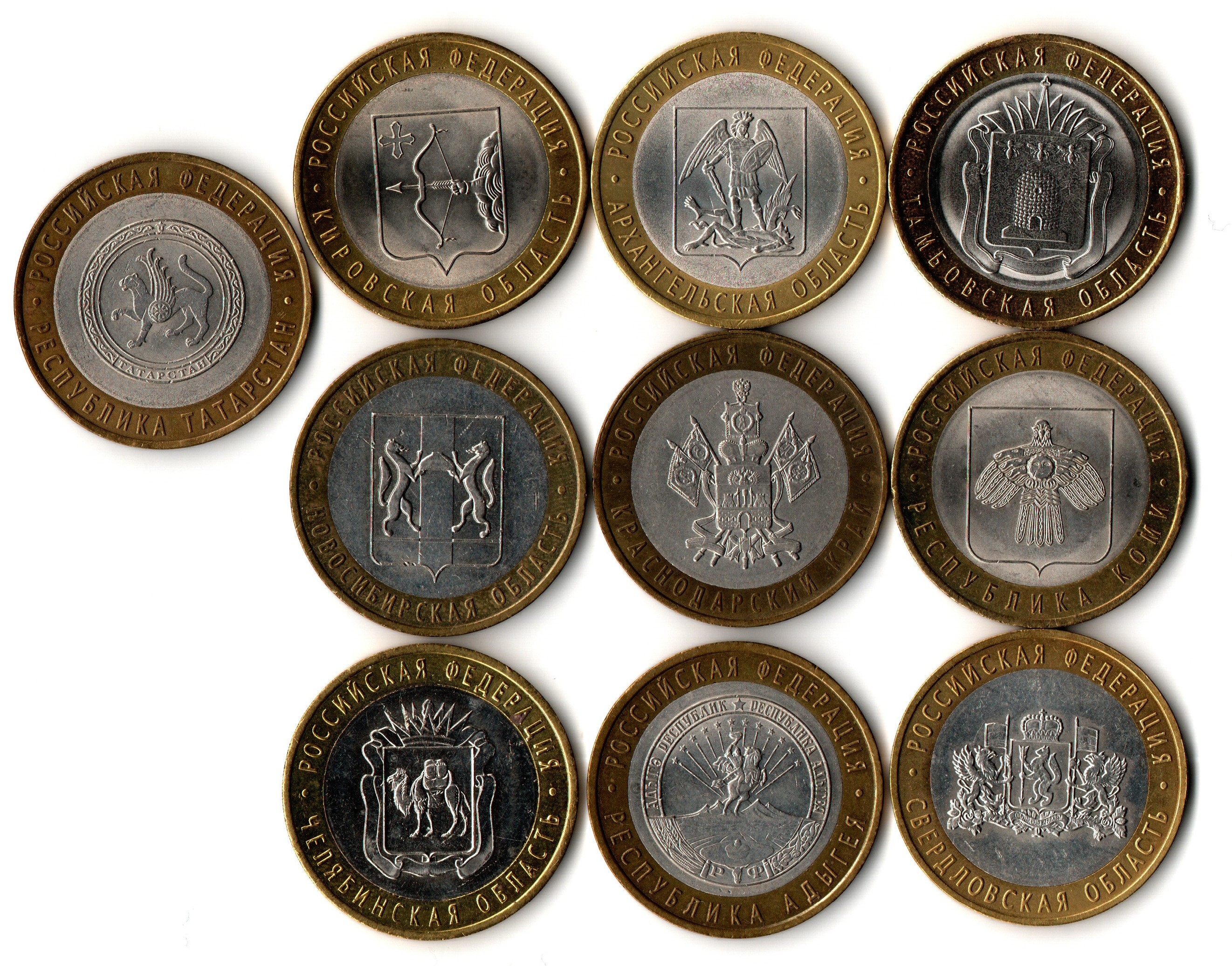 Набор монет 10 рублей биметалл 10 шт Новосибирская, Свердловская, Челябинская, Татарстан, Архангельская, Тамбов, Киров, Адыгея, Краснодарский, Коми XF