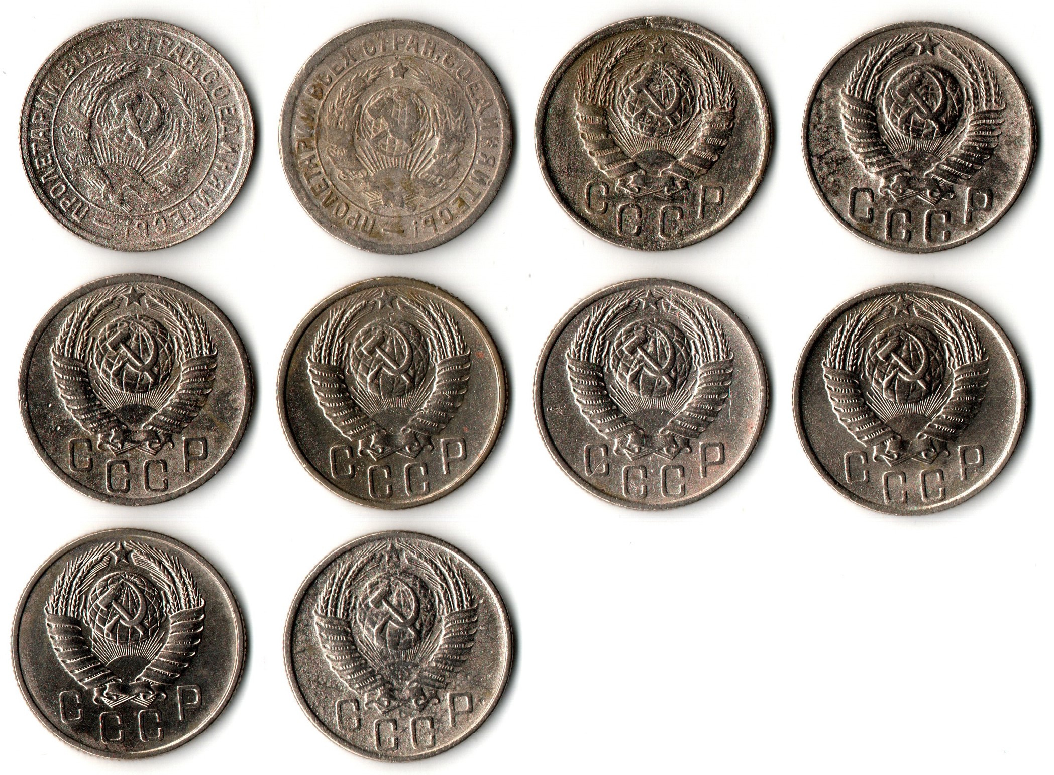 Набор монет 15 копеек 1932,33,43,48,52,53,54,55,56,57 (10 шт) (F-XF) (2)
