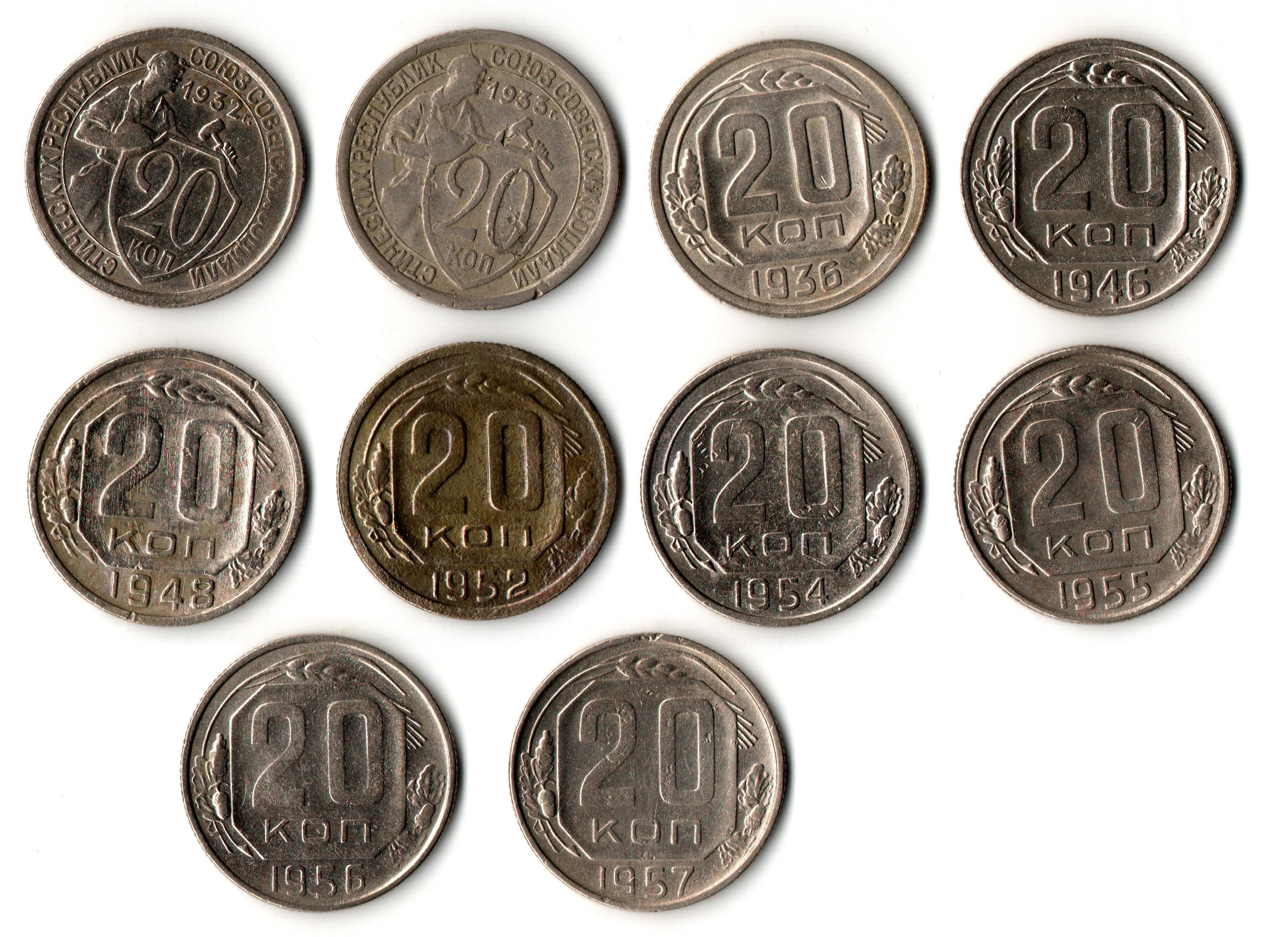 Набор монет 20 копеек 1932.33,36,46,48,52,54,55,56,57 (10 шт) (F-XF) (2)
