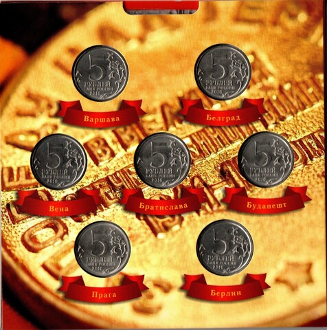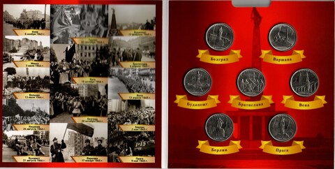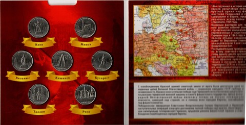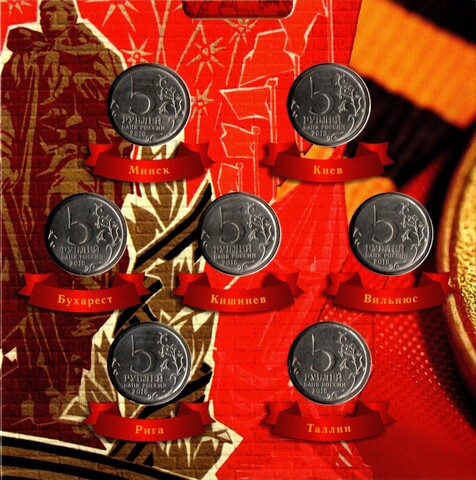 Набор монет 5 рублей 14 шт в коллекционном альбоме. Освобожденные столицы 1941-45 гг. UNC