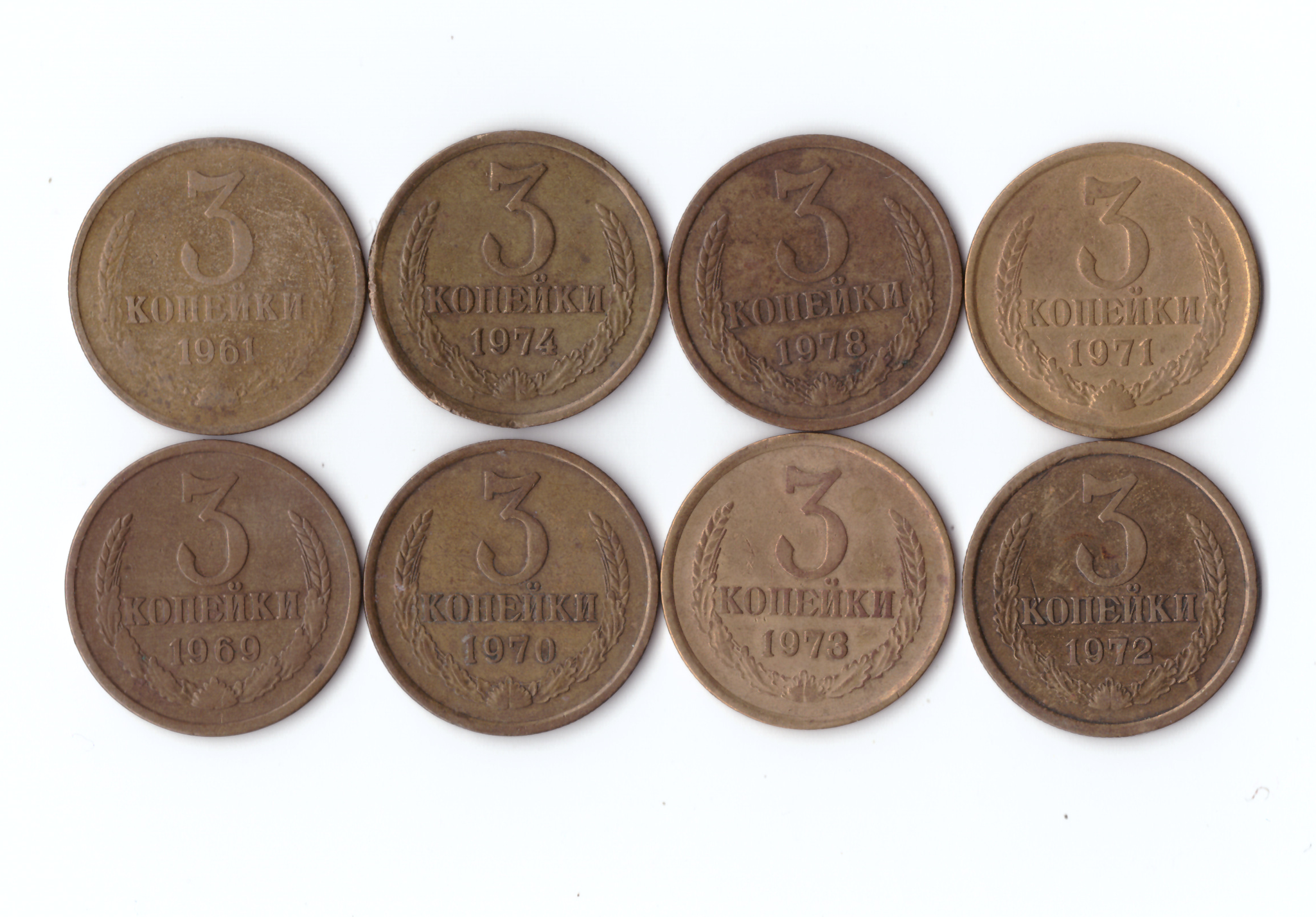 Набор монет (8шт) 3 копейки 1961,69-74,78гг. XF