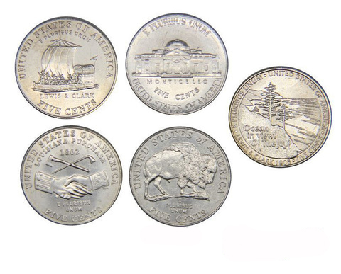 Монеты номиналом 5 центов с изображением 3-го президента США Томаса Джефферсона стали выпускаться с 1938 года. Основой его изображения на аверсе монеты послужил мраморный бюст французского скульптора Гудона, сделанный во время пребывания Джефферсона во Франции. По краю монеты полукругом располагались полукругом надписи «IN GOD WE TRUST», «LIBERTY» и год чеканки монеты. Под изображением Джефферсона располагалась монограмма гравёра.