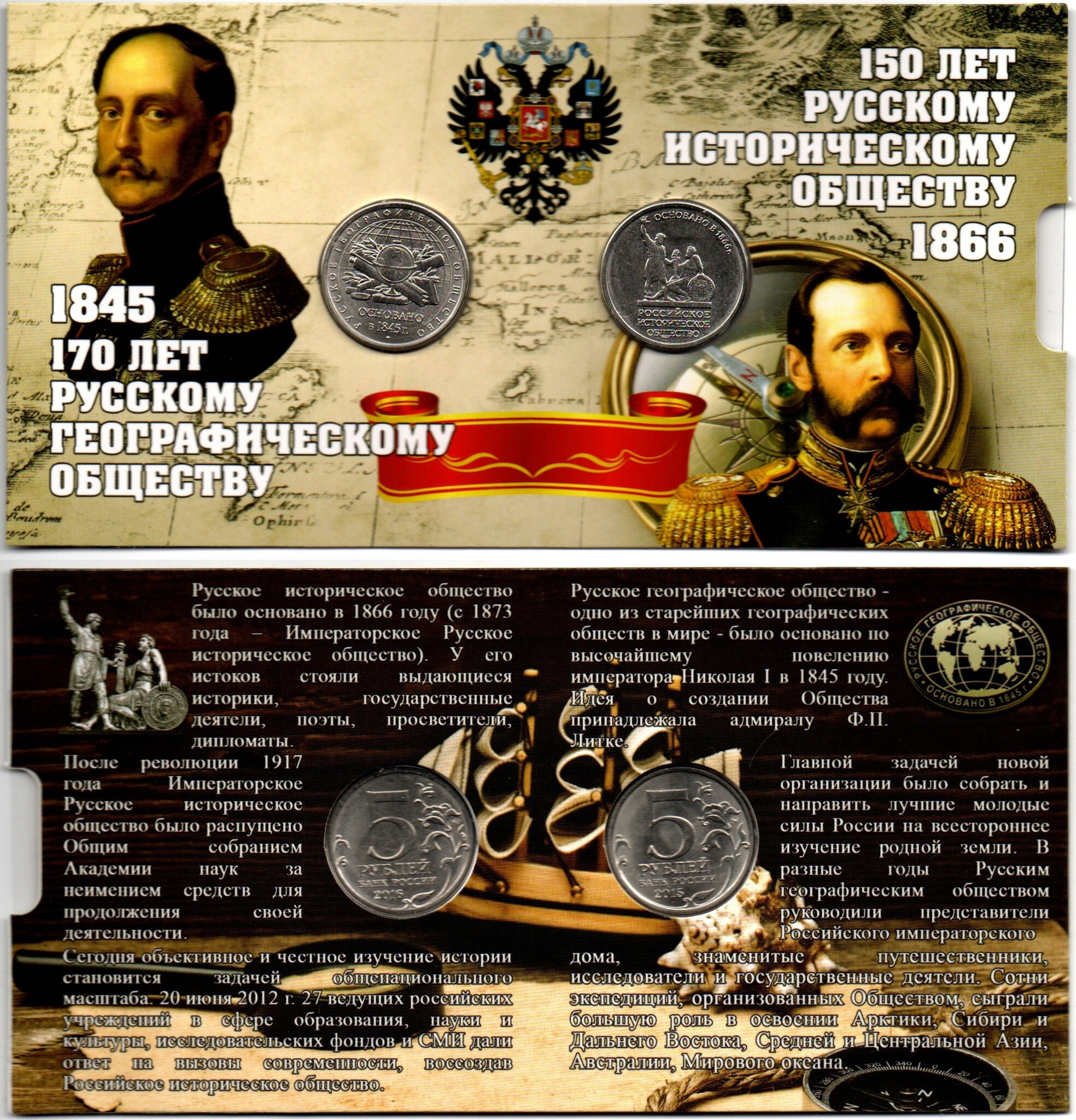 Набор монет Русское историческое и географическое общество 150 и 170 лет 2 шт. в буклете UNC