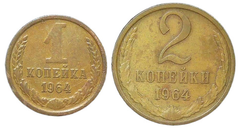 Набор монет СССР 1964 (2 монеты) 1 и 2 копейки (XF)