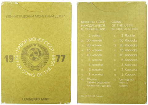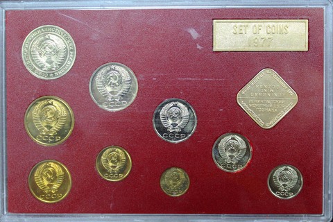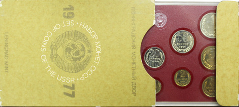 Годовой набор Госбанка СССР 1977 года ("жёсткий"). Набор состоит из 9 монет: 1, 2, 3, 5, 10, 15, 20, 50 копеек, 1 рубля, жетона ЛМД (Ленинградский монетный двор) ромбовидной формы и шильдика. Подложка красного цвета, конверт жёлтый.