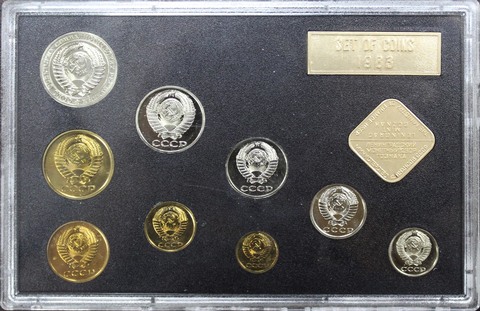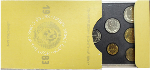 Набор состоит из 9 монет: 1, 2, 3, 5, 10, 15, 20, 50 копеек, 1 рубля, жетона ЛМД (Ленинградский монетный двор) ромбовидной формы и шильдика.