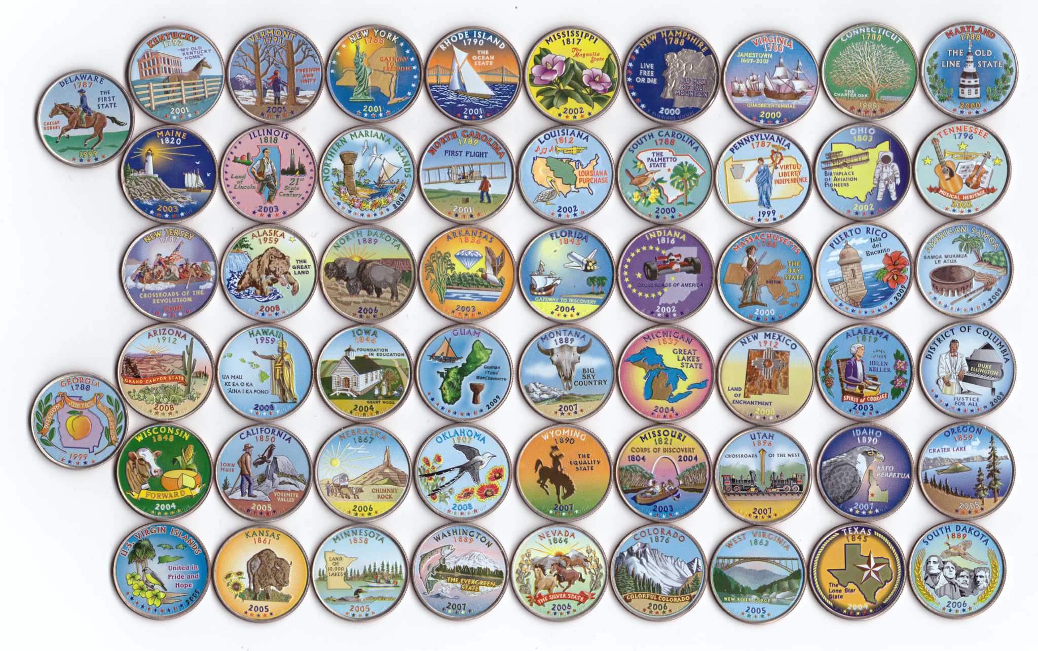 Набор Штаты и Территории квотеры 25 центов 56 штук 1999-2009 гг. Двор P цветная эмаль (Монета)