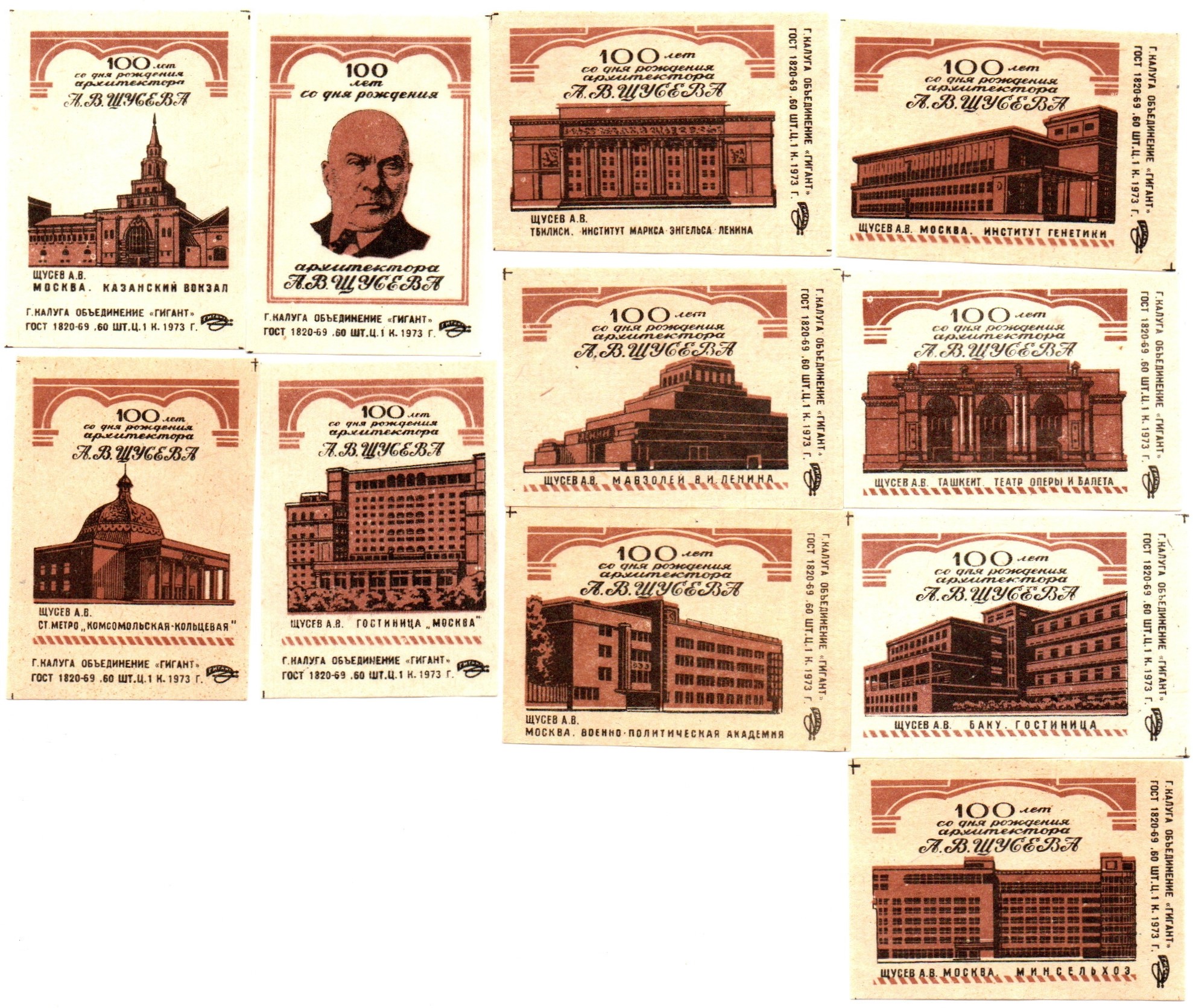 Набор спичечных этикеток - 100 лет со дня рождения Щусева - Калуга Гигант - 1973 год - 11 штук