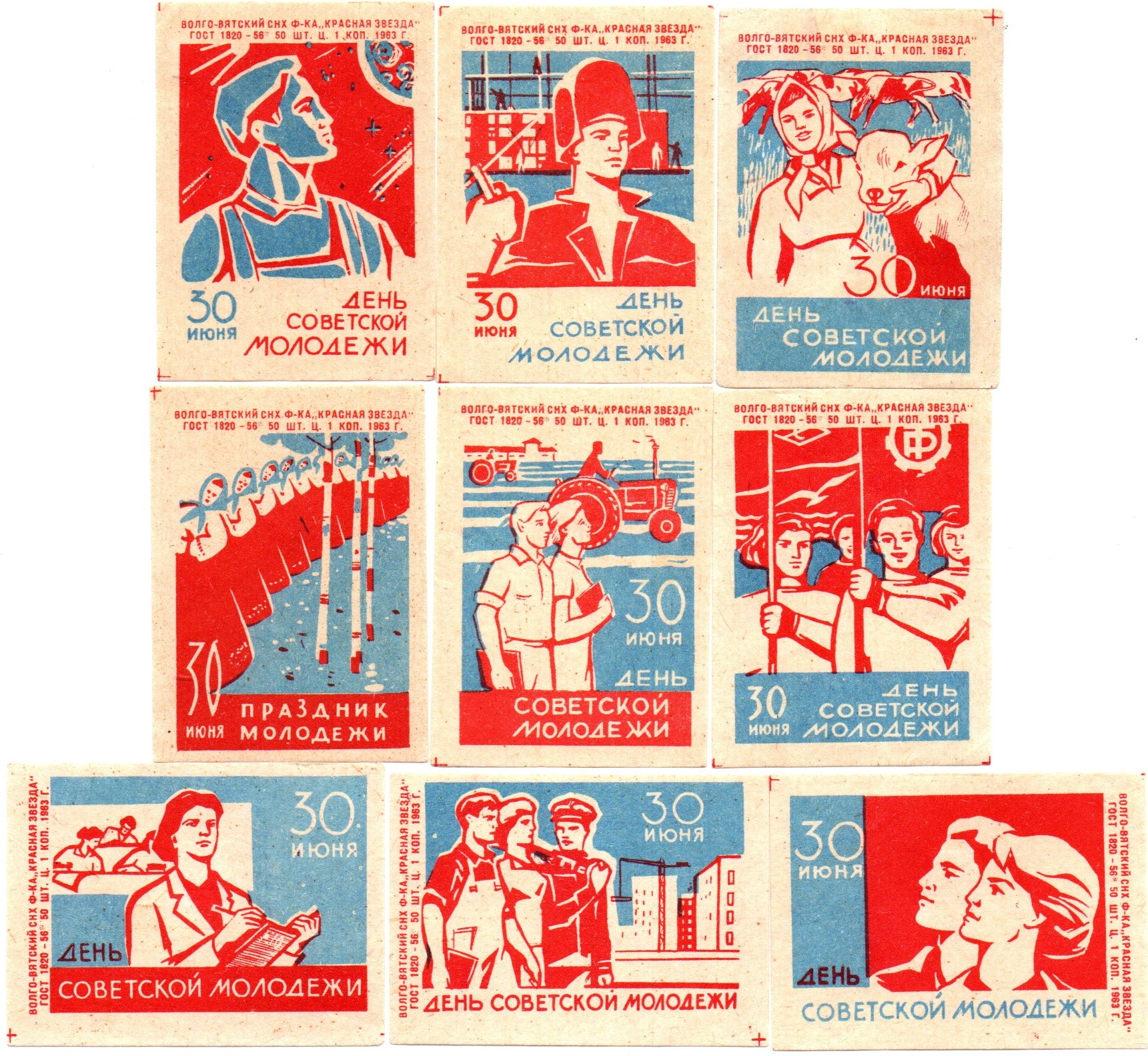 Набор спичечных этикеток - День советской молодежи - Киров Красная звезда 1963 год - 9 штук