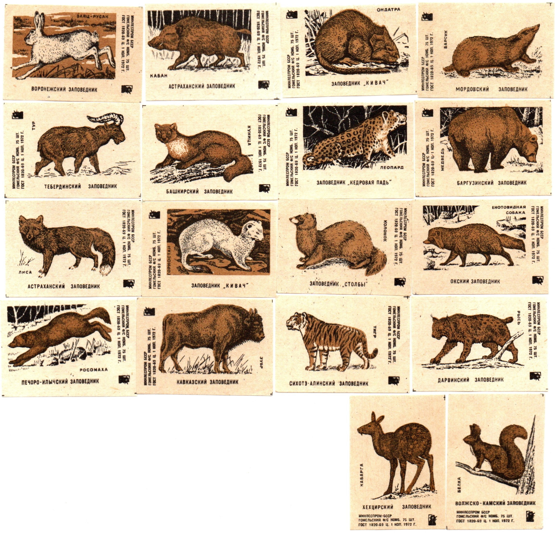 Набор спичечных этикеток - Заповедники СССР - БССР Гомель 1972 год - 18 штук