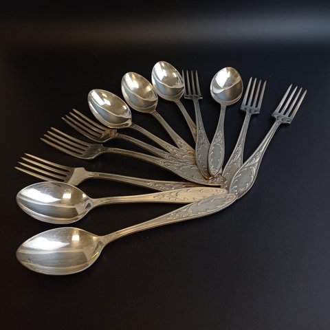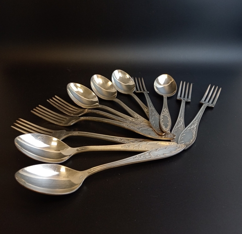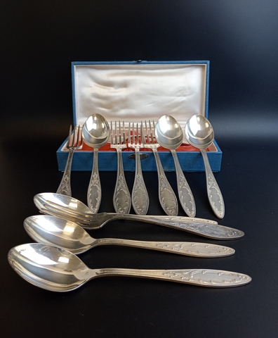 Набор столовых ложек и вилок 12 предметов "Пламя" на 6 персон в оригинальной коробке, МНЦ (медь-никель-цинк), Оленегорский механический завод, СССР, 1970-1980 гг.