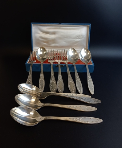 Набор столовых приборов 12 предметов, их них 6 ложек и 6 больших вилок мельхиор - Пламя на 6 персон в оригинальной коробке, МНЦ (медь-никель-цинк), Оленегорский механический завод, СССР, 1970-1980 гг.