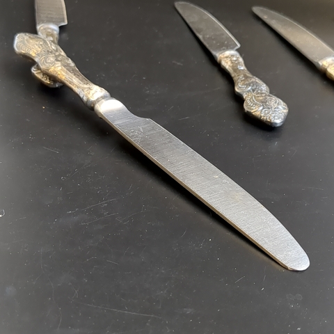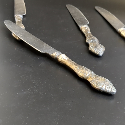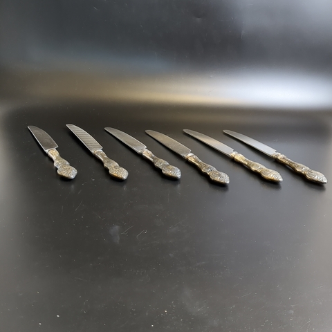 Набор столовых ножей с растительным декором на 6 персон, мельхиор (медь-никель), нержавеющая сталь, Ржевский механический завод (РМЗ), СССР, 1970-1980 гг