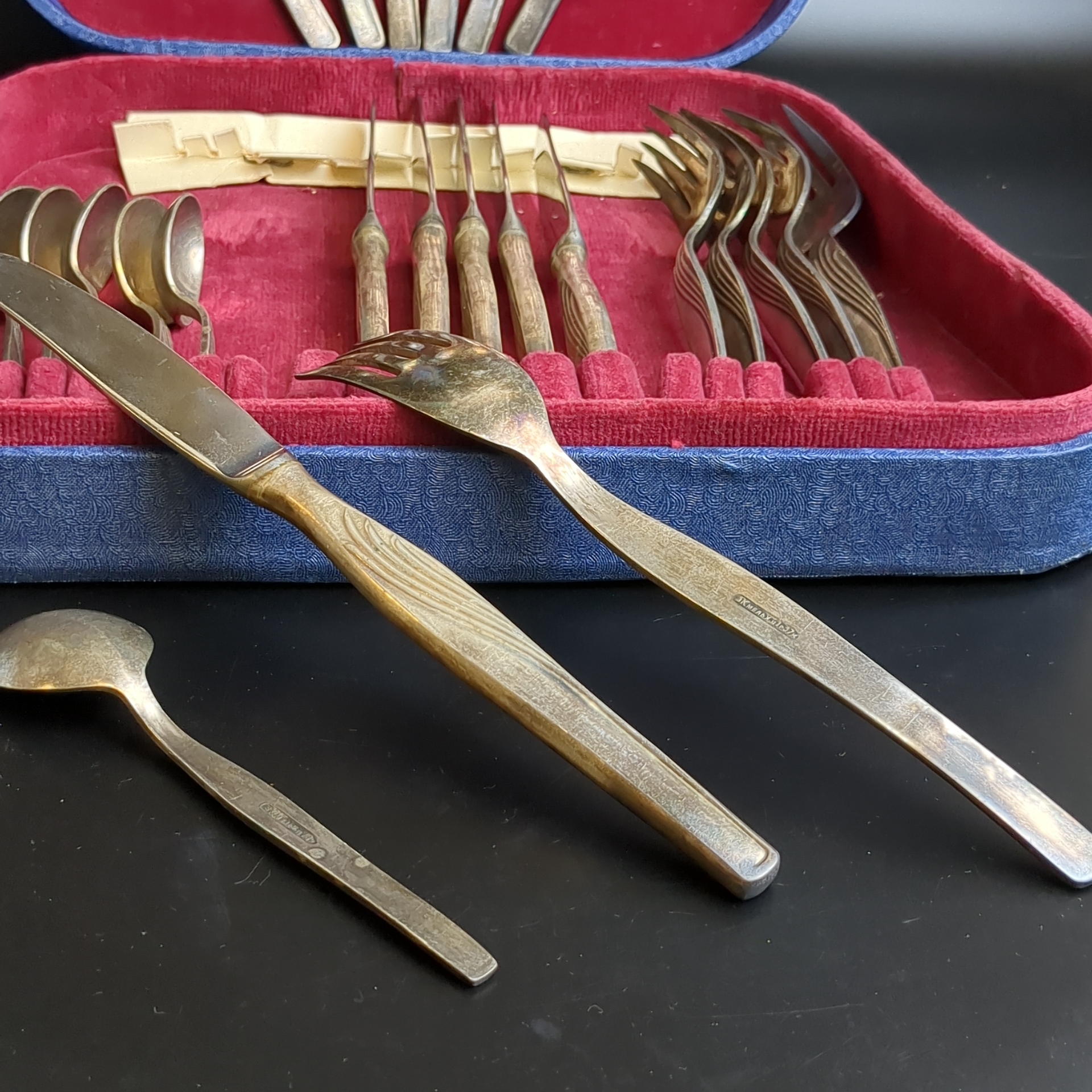 Набор столовых приборов на 6 персон (24 предмета) в оригинальной упаковке, мНЦ (медь-никель-цинк), Павловский завод художественных металлоизделий им. С.М. Кирова, СССР, 1960-1990 гг.