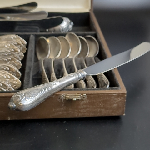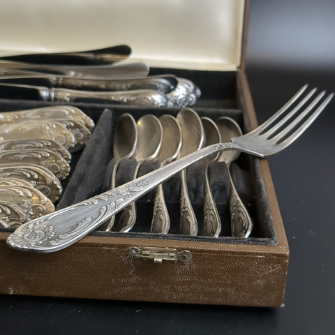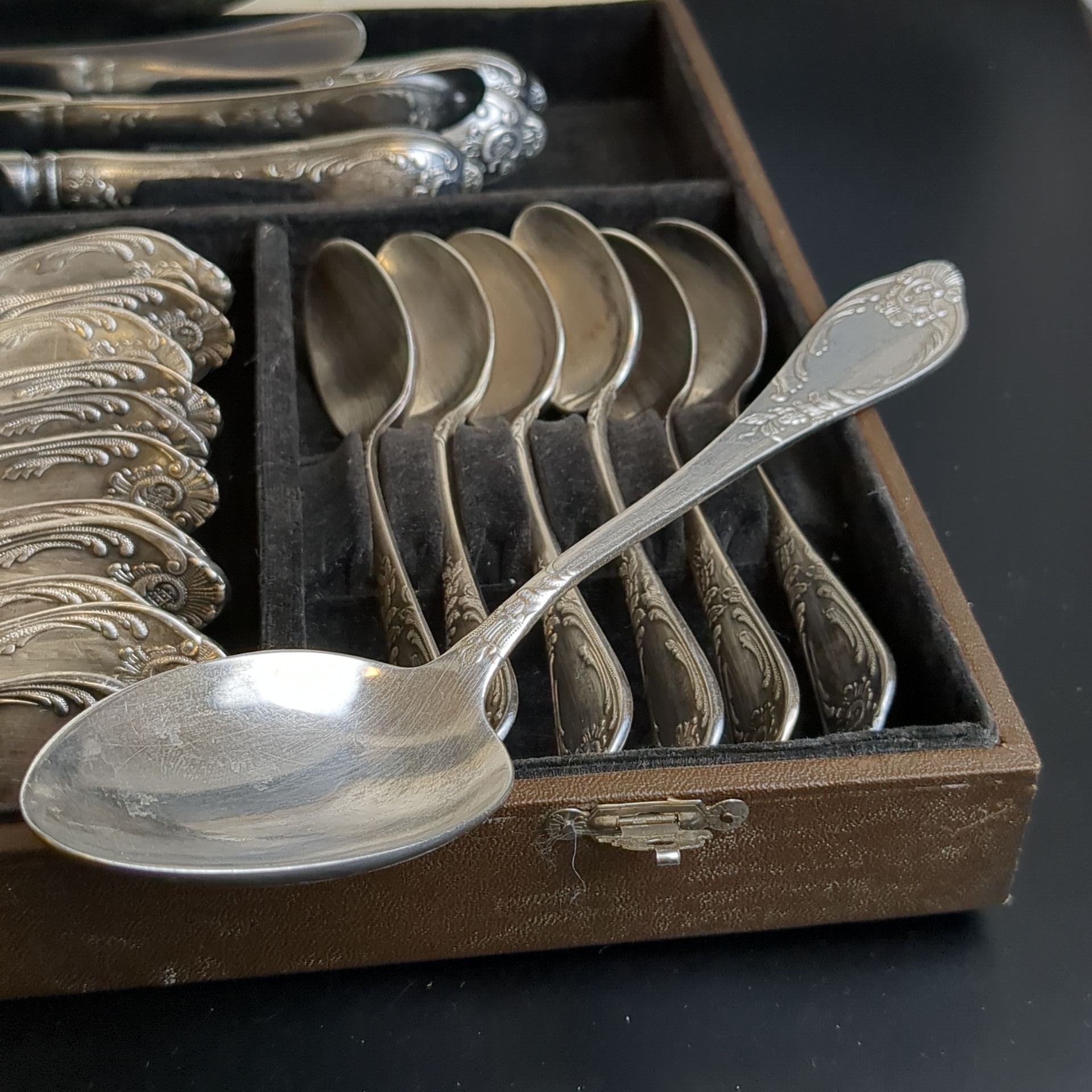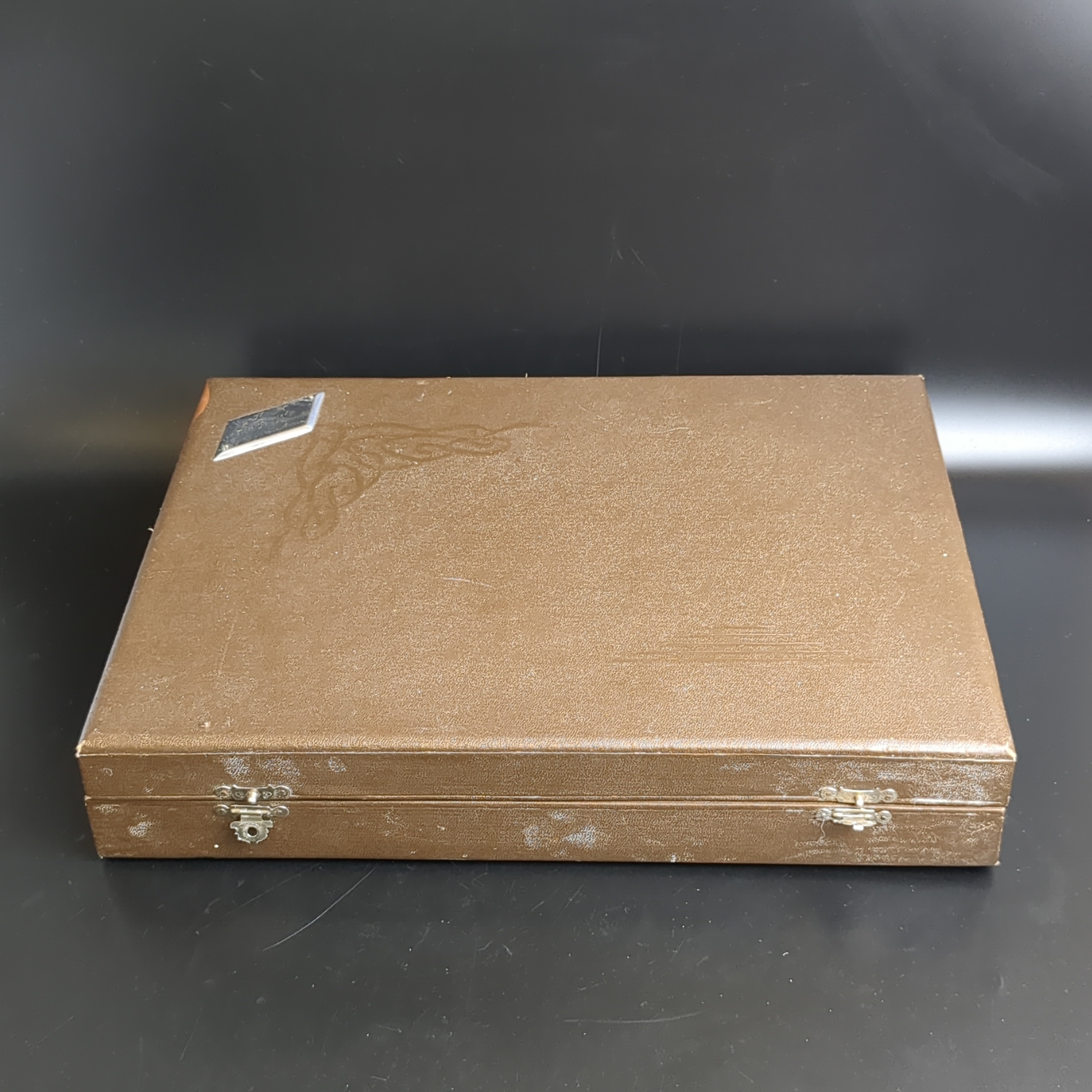 Набор столовых приборов на 6 персон (24 предмета) в оригинальной упаковке, мНЦ (медь-никель-цинк), Вольнянский завод столовых приборов им. Шевченко (ЗiШ, ЗиШ), СССР, 1960-1990 гг. Следы бытования. Состояние на фото