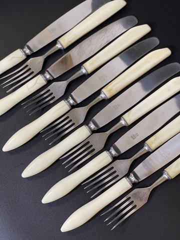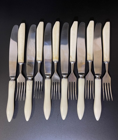 Комплект столовых приборов СССР из 12 штук. Металл нержавейка. Ручка Кость. 6 вилок и 6 ножей. 1970-1990 гг.