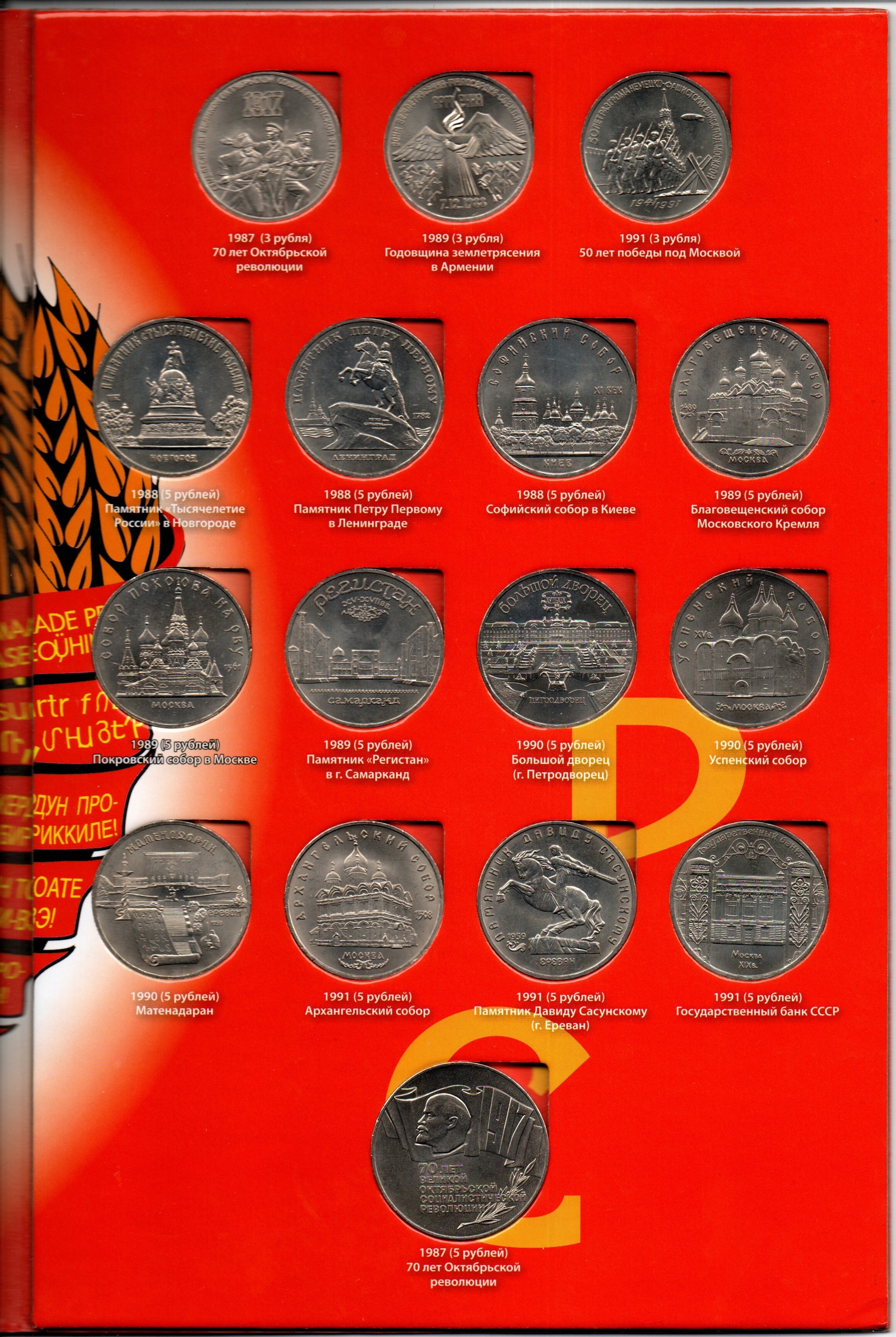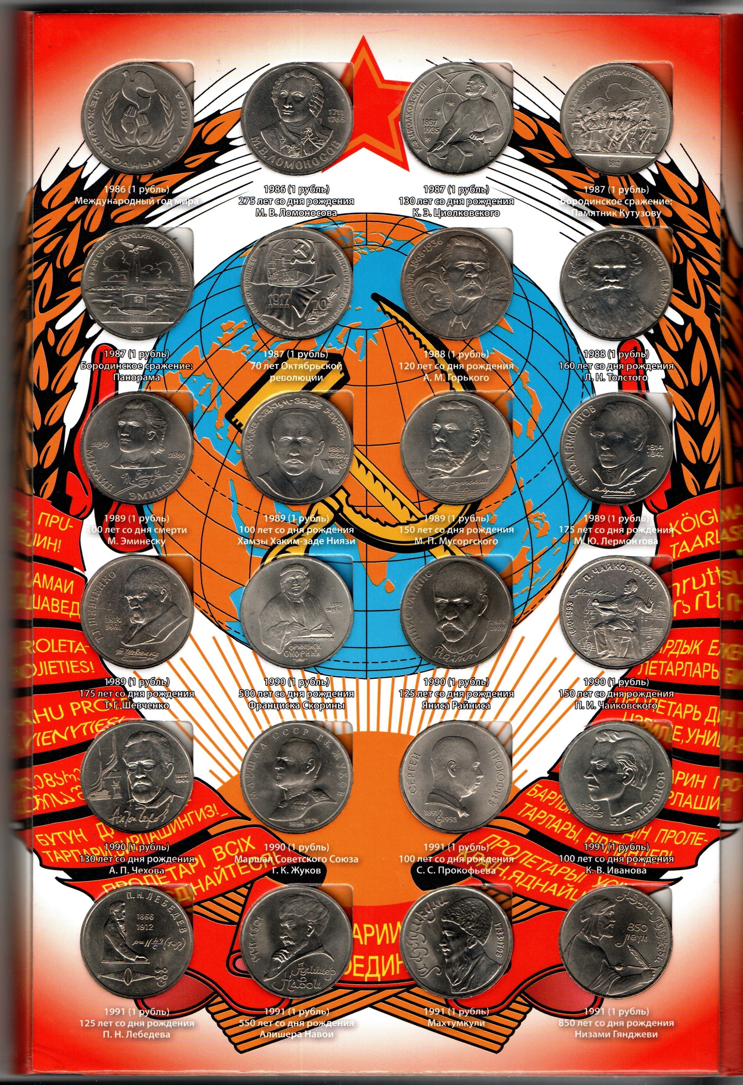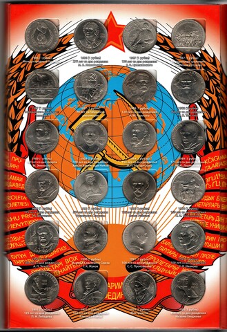 Набор юбилейных монет СССР (64 монеты), включая "шайбу". Список монет : 1 рубль 20 лет Победы над Германией 1965 1 рубль 50 лет Советской власти 1967 1 рубль 100 лет со дня рождения В. И. Ленина 1970 1 рубль 30 лет Победы в Великой Отечественной войне 1975 1 рубль 60 лет Советской власти 1977 1 рубль Олимпиада 1980. Эмблема Олимпийских игр 1977 1 рубль Олимпиада 1980. Московский Кремль 1978 1 рубль Олимпиада 1980. Здание МГУ 1979 1 рубль Олимпиада 1980. Обелиск покорителям космоса 1979 1 рубль Олимпиада 1980. Здание Моссовета 1980 1 рубль Олимпиада 1980. Олимпийский факел 1980 1 рубль 20 лет полёта в космос Ю. Гагарина 1981 1 рубль Дружба навеки 1981 1 рубль 60 лет образования СССР 1982 1 рубль 20 лет полёта в космос В. Терешковой 1983 1 рубль 400 лет со дня смерти И. Фёдорова 1983 1 рубль 165 лет со дня рождения К. Маркса 1983 1 рубль 185 лет со дня рождения А. С. Пушкина 1984 1 рубль 150 лет со дня рождения Д. И. Менделеева 1984 1 рубль 125 лет со дня рождения А. С. Попова 1984 1 рубль 115 лет со дня рождения В. И. Ленина 1985 1 рубль 165 лет со дня рождения Ф. Энгельса 1985 1 рубль 40 лет победы над Германией 1985 1 рубль Фестиваль молодёжи и студентов в Москве 1985 1 рубль 275 лет со дня рождения М. В. Ломоносова 1986 1 рубль Международный год мира 1986 1 рубль 175 лет Бородино. Барельеф 1987 1 рубль 175 лет Бородино. Обелиск 1987 1 рубль 130 лет со дня рождения К. Э. Циолковского 1987 1 рубль 70 лет Октябрьской революции 1987 3 рубля 70 лет Октябрьской революции 1987 5 рублей 70 лет Октябрьской революции 1987 1 рубль 120 лет со дня рождения А. М. Горького 1988 1 рубль 160 лет со дня рождения Л. Н. Толстого 1988 5 рублей Памятник Петру I в Ленинграде 1988 5 рублей Памятник «Тысячелетие России» в Новгороде 1988 5 рублей Софийский собор в Киеве 1988 1 рубль 150 лет со дня рождения М. П. Мусоргского 1989 1 рубль 175 лет со дня рождения Т. Г. Шевченко 1989 1 рубль 175 лет со дня рождения М. Ю. Лермонтова 1989 1 рубль 100 лет со дня рождения Х. Х. Ниязи 1989 1 рубль 100 лет со дня смерти М. Эминеску 1989 3 рубля Помощь пострадавшим от землетрясения в Армении 1989 5 рублей Собор Покрова на Рву в Москве 1989 5 рублей Ансамбль Регистан в Самарканде 1989 5 рублей Благовещенский собор в Москве 1989 1 рубль 130 лет со дня рождения А. П. Чехова 1990 1 рубль 150 лет со дня рождения П. И. Чайковского 1990 1 рубль Маршал СССР Г. К. Жуков 1990 1 рубль 500 лет со дня рождения Ф. Скорины 1990 1 рубль 125 лет со дня рождения Я. Райниса 1990 5 рублей Большой дворец в Петродворце 1990 5 рублей Успенский собор в Москве 1990 5 рублей Матенадаран в Ереване 1990 1 рубль 550 лет со дня рождения А. Навои 1991 1 рубль 125 лет со дня рождения П. Н. Лебедёва 1991 1 рубль 100 лет со дня рождения С. С. Прокофьева 1991 1 рубль Махтумкули 1991 1 рубль 100 лет со дня рождения К. В. Иванова 1991 1 рубль 850 лет со дня рождения Н. Гянджеви 1991 3 рубля 50 лет победы под Москвой 1991 5 рублей Архангельский собор в Москве 1991 5 рублей Здание Госбанка СССР в Москве 1991 5 рублей Памятник Давиду Сасунскому в Ереване 1991
