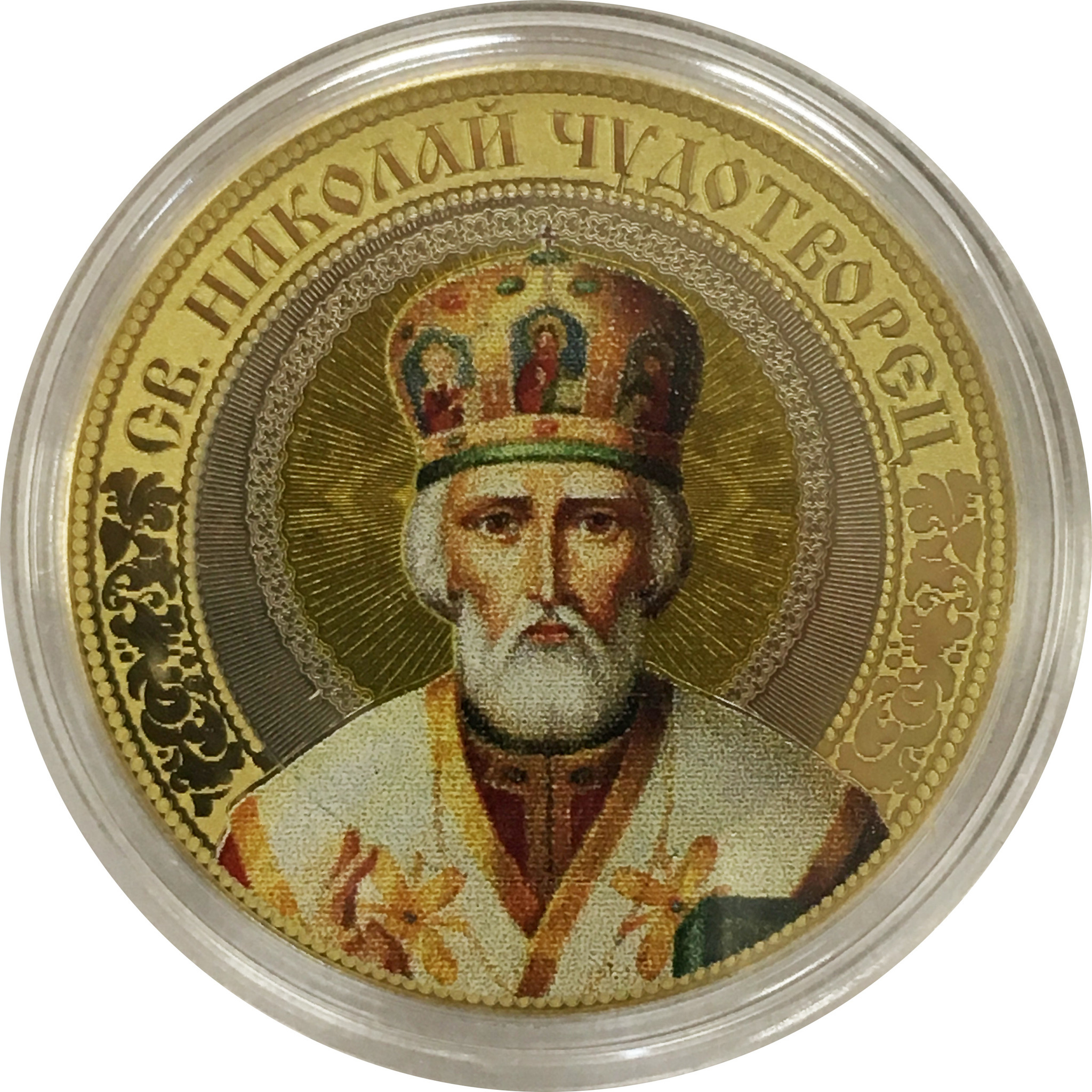 Сувенирная монета "Николай Чудотворец" номиналом 10 рублей с выгравированным изображением.