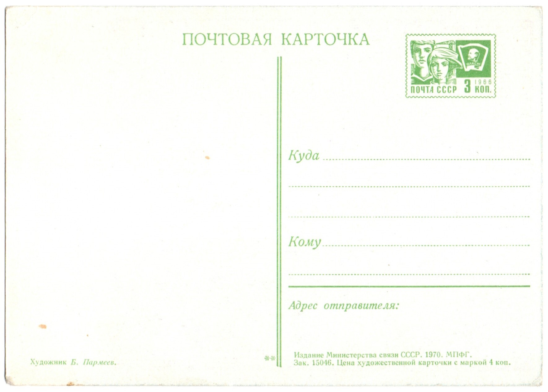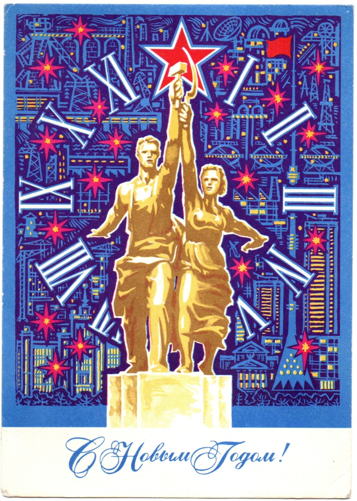 Новогодняя почтовая карточка художник Б. Пармеев "Серп и молот, рабочий и колхозница", чистая, СССР 1970 год.