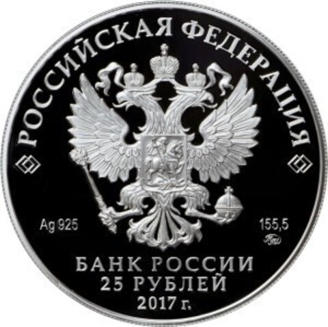 на зеркальном поле диска – рельефное изображение Государственного герба Российской Федерации, над ним вдоль канта – надпись полукругом: "РОССИЙСКАЯ ФЕДЕРАЦИЯ", обрамленная с обеих сторон сдвоенными ромбами, внизу под гербом: слева – обозначения драгоценного металла и пробы сплава, справа – содержание химически чистого металла и товарный знак монетного двора, внизу в центре в три строки – надпись: "БАНК РОССИИ", номинал монеты: "25 РУБЛЕЙ", год выпуска: "2017 г.".