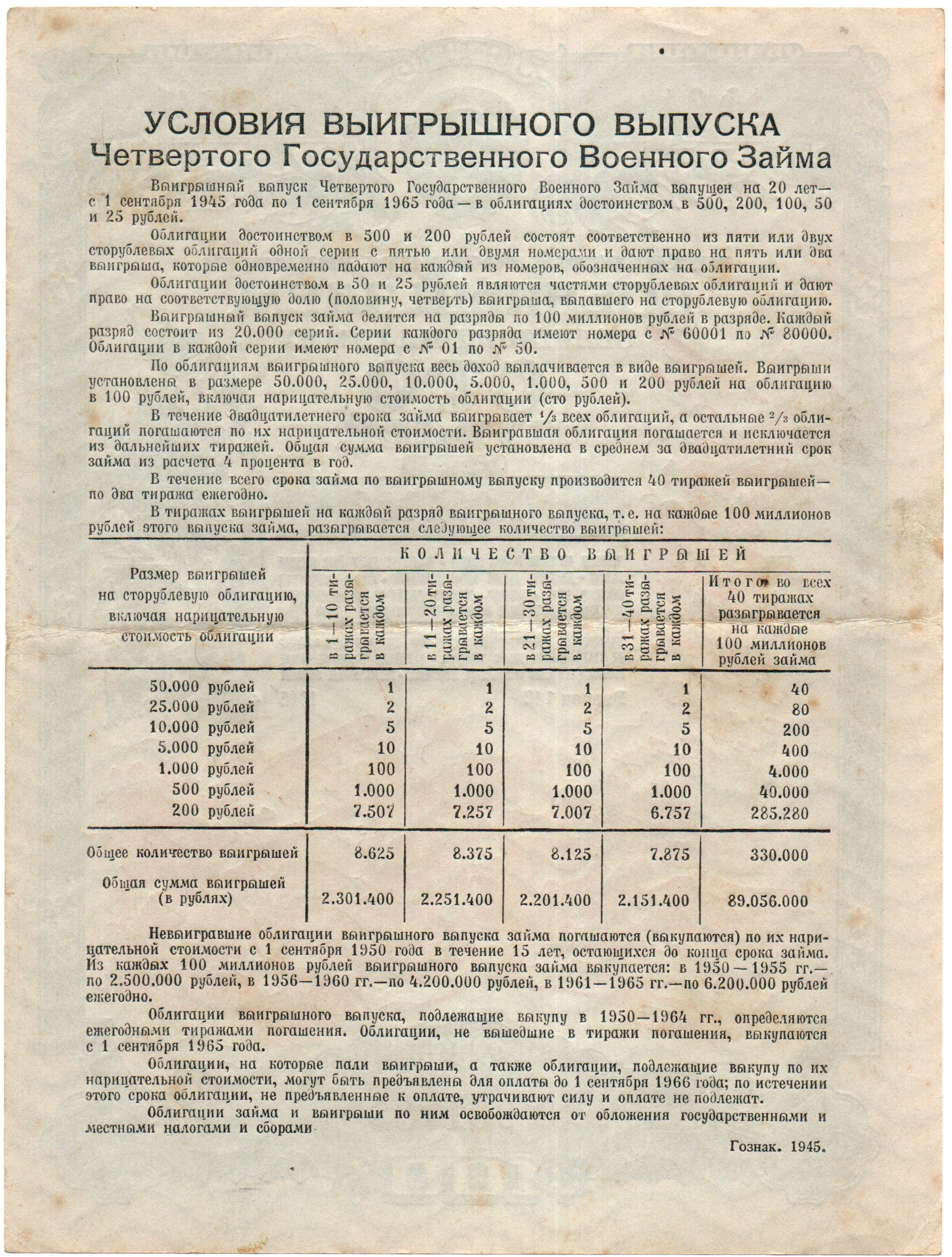 Облигация 100 рублей 1945 год. 4-ый государственный военный заем. Серия 061782. VF