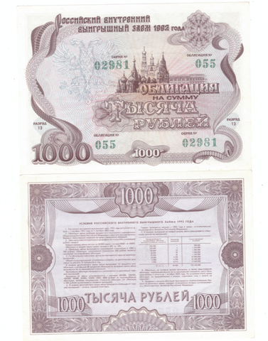 Облигация 1992 года на сумму 1000 рублей XF-AU